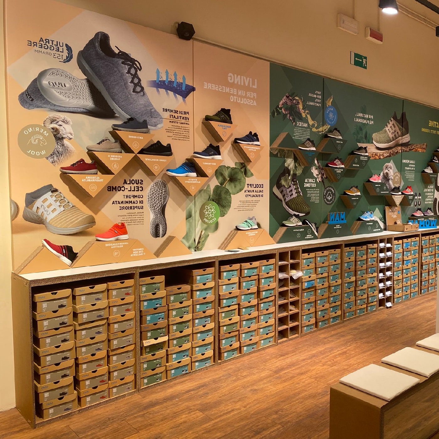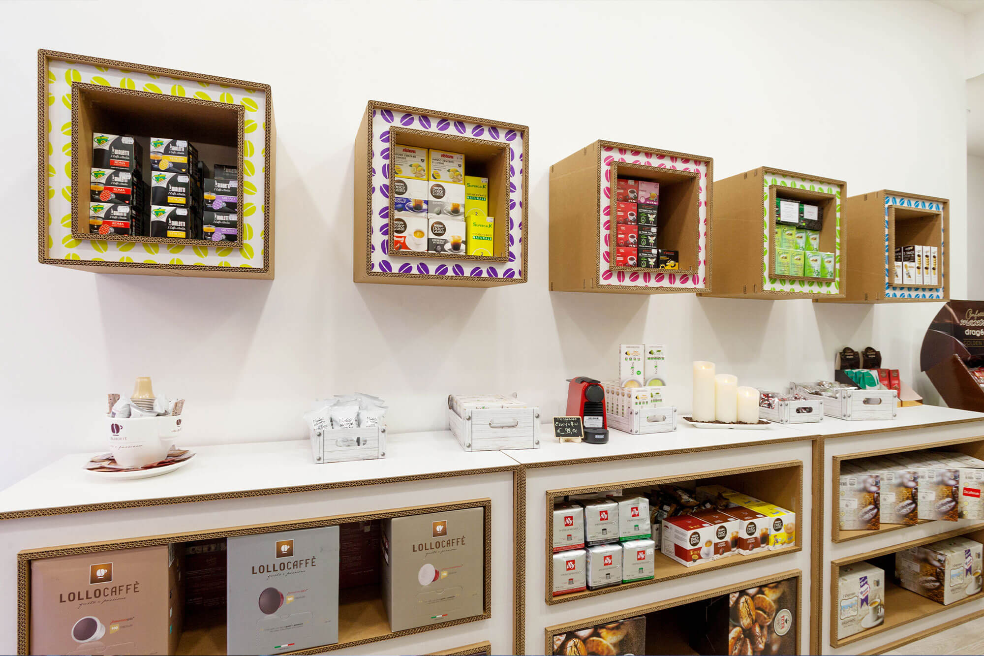 Immagini delle nostre realizzazioni di negozi, allestiti interamente con prodotti in cartone. i negozi vengono progettati al fianco dei clienti per la massima resa visiva, nel rispetto del brand e dell’ambiente.