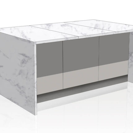 Una linea di cucine in cartone stampate con finiture in marmo di carrara per il top e grigio chiaro per il fronte per un effetto incredibilmente realistico