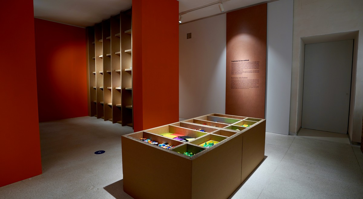 Nella sala interattiva, i visitatori invece possono partecipare attivamente alla mostra. Sono stati posizionati grandi contenitori in cartone riempiti di costruzioni, permettendo a grandi e piccini di creare il proprio modello di capanna, che poi veniva esposto come parte dell’installazione artistica su scaffali realizzati in cartone della serie Flua. Questa interazione diretta ha reso la mostra non solo osservabile ma anche esperibile e partecipativa.
