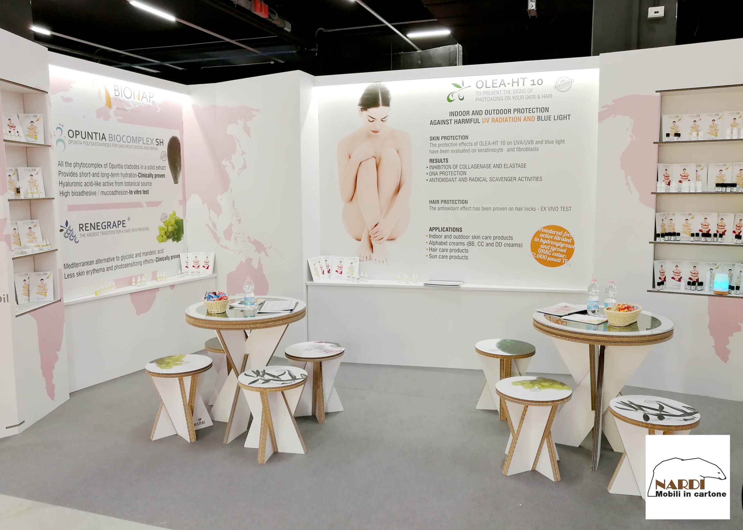 Lo stand si componeva di una parete di fondo continuativa in cartone naturale con finitura bianca che delimitavano il perimetro dell’area nuda da coprire. Su queste pareti abbiamo ricavato delle nicchie espositive dotate di ripiani in cartone ed alte più ampie all’interno delle quali sono state stampate immagini promozionali dei prodotti alternate a quelle dei frutti e ei fiori da cui vengono estratti i principi attivi. Dietro lo stand abbiamo ricavato un vano sgabuzzino dotato di porta che funge da spazio di servizio. Su un lato dello stand abbiamo posizionato un banco reception personalizzato della serie Verra A con ganci portaborse e tasche porta brochures per accogliere i visitatori e dare le prime informazioni. A completamento dello stand sono state inseriti arredi in cartone naturali come tavoli con ripiani in vetro della serie Ortles e sgabelli con rivestimento di cuscini in cotone della serie.