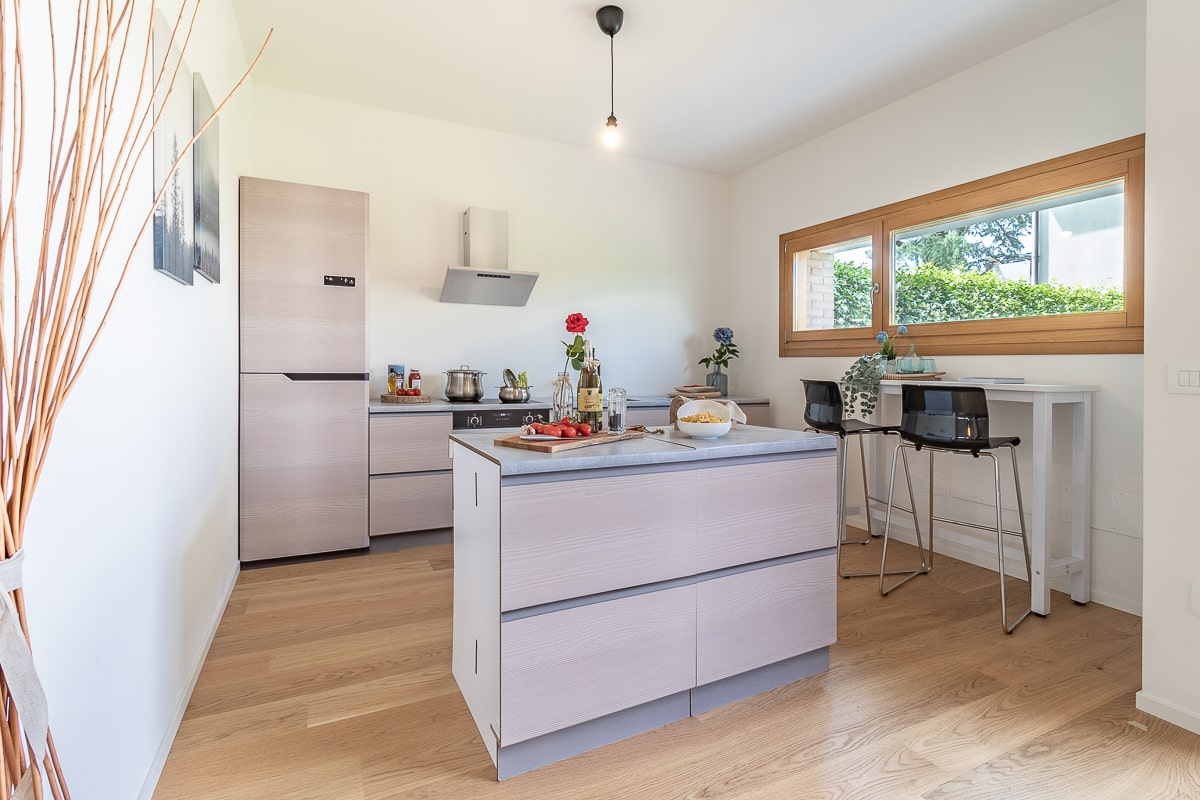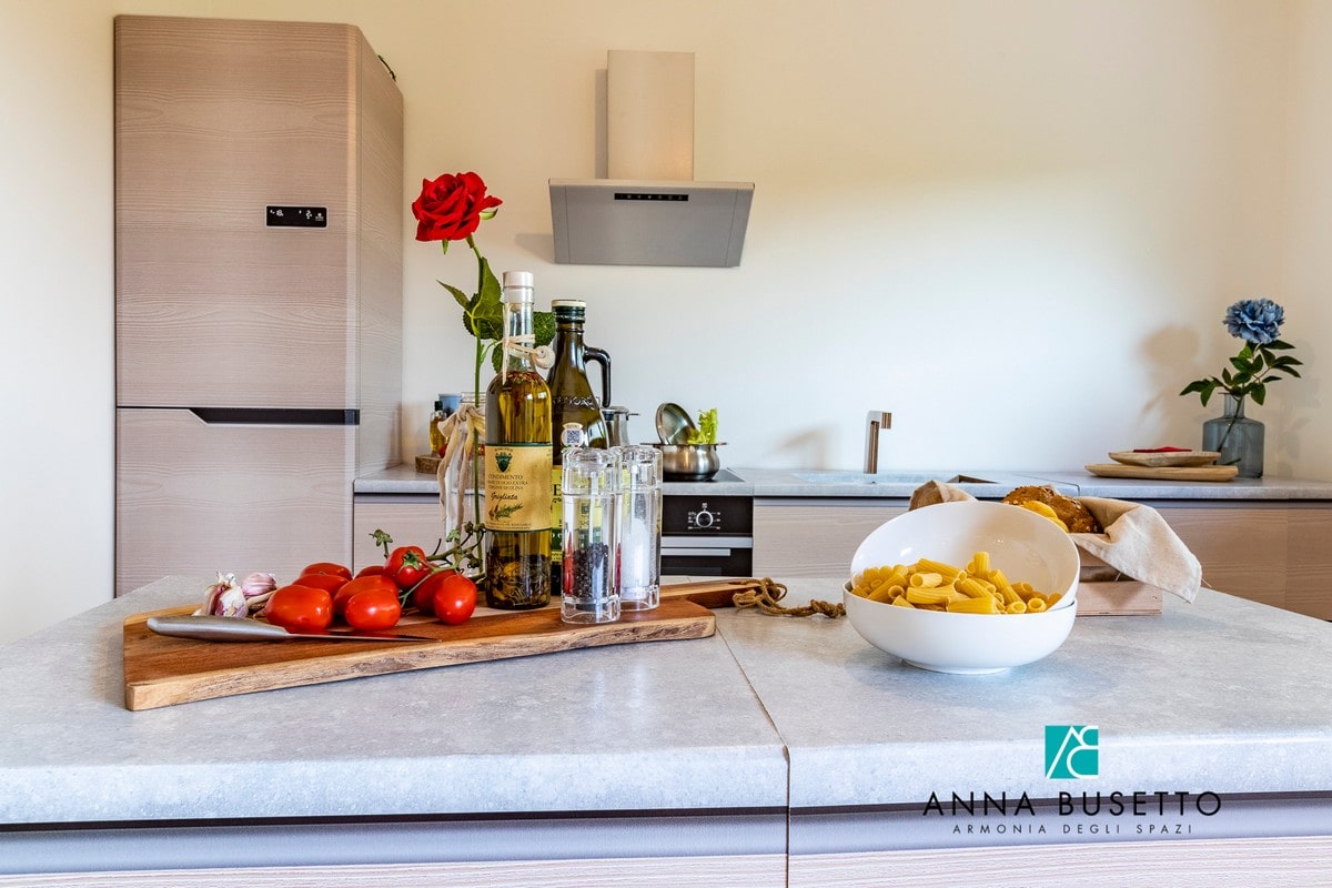 Per valorizzare una casa a schiera a Castelfranco Veneto Anna Busetto ha utilizzato la nuova cucina in cartone per della linea Miage  per gli allestimenti di Home Staging. Il payoff scelto da Anna per promuovere il suo lavoro è “Armonia degli spazi” e in effetti questo allestimento rispecchia in pieno questa filosofia: il locale è valorizzato in tutti i suoi spazi, grazie a un’efficace scelta degli arredi. Una parete è interamente occupata dai moduli della cucina, con finiture che replicano fedelmente l’effetto legno e pietra. Dalle foto si vede sulla sinistra il moderno frigorifero da 200 cm, seguito dai pensili e da un modulo da 60 con stampa  “forno elettrico + fornelli a induzione” e lavandino. Sopra i fuochi c’è anche la cappa in cartone. Molto azzeccata anche la scelta di posizionare a centro stanza un’isola con la stessa tipologia di finiture, ottenuta accostando due moduli cassetti da 90 cm. Congratulazioni ad Anna per l’ottimo lavoro: un allestimento home staging by Natur Design della cucina che emoziona e convince!