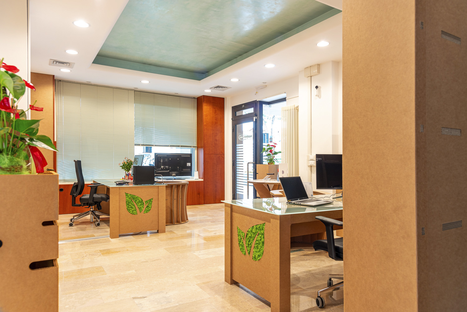 Per le sedute abbiamo selezionato le nostre poltrone Crava, autentici esempi di ecodesign che dimostrano la versatilità progettuale del cartone naturale. Dotate di comoda imbottitura in cotone ecologico, queste sedute rappresentano l’eccellenza nell’arredamento per negozi sostenibile. A completamento dell’area conversazione, abbiamo integrato gli sgabelli Ortels, dalla linea più moderna e dalla fruibilità immediata.