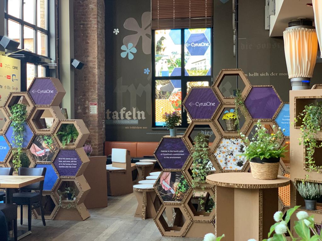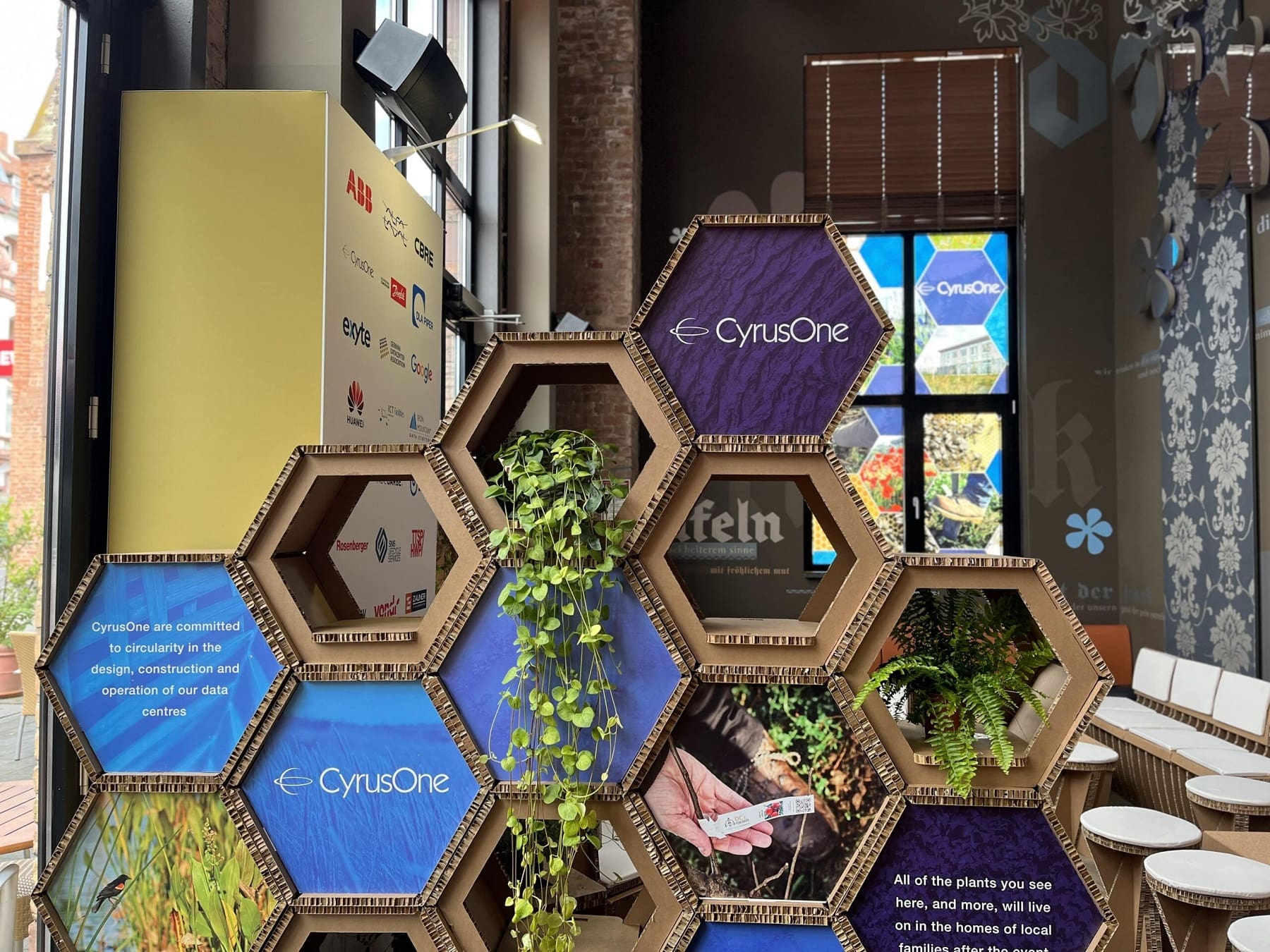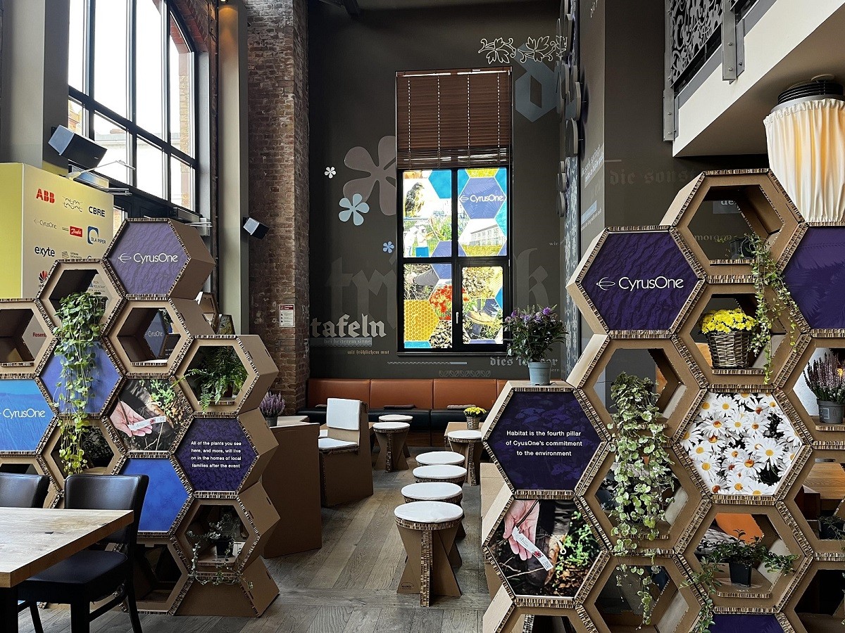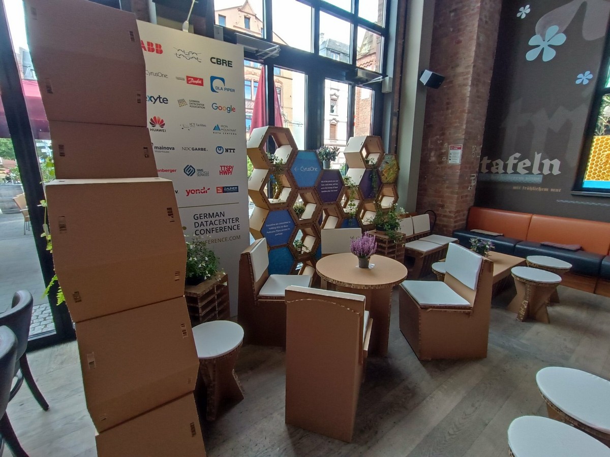 “CyrusOne è stata entusiasta di riutilizzare i mobili in cartone ecologico e riciclabile al 100% per la seconda volta quest’anno, presentandoli alla prima conferenza tedesca sui data centers. L’intento era quello di creare uno spazio lounge rilassante e confortevole, dove clienti, partner e fornitori potessero continuare a informarsi su come stiamo sostenendo la biodiversità nei nostri siti europei.