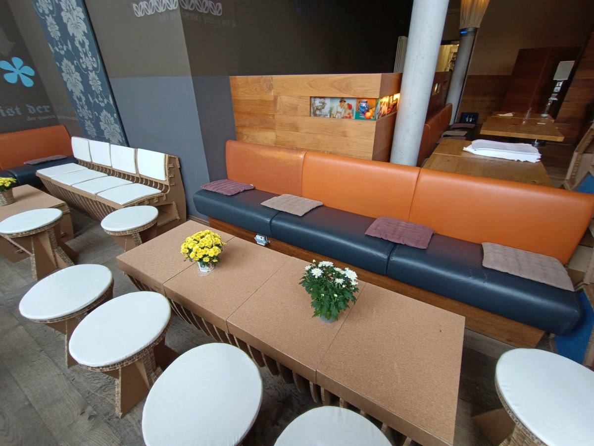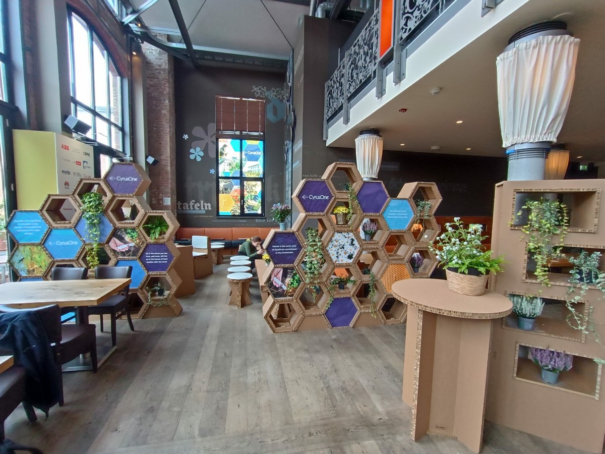 E, a distanza di 6 mesi, CyrusOne ha contattato Natur Design per chiedere che gli arredi venissero spediti a Francoforte sul Meno, dove sarebbero stati utilizzati per creare un lounge bar per la Conferenza tedesca sui Data Centers. In questo caso è stato il cliente stesso a ricevere la merce e a montare e predisporre gli arredi: una dimostrazione del fatto che i mobili in cartone sono sempre progettati per durare nel tempo e per essere facilmente assemblati, grazie ad intuitive soluzioni ad incastro. Le foto qui sotto sono state scattate presso il lounge bar a Francoforte, tranne le ultime 3 dove si vede l’allestimento dello stand a Monaco…che dire un utilizzo smart di un eco allestimento efficace e flessibile!