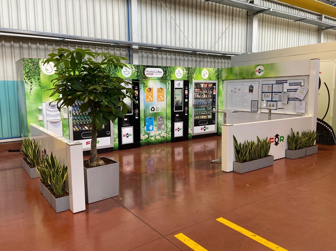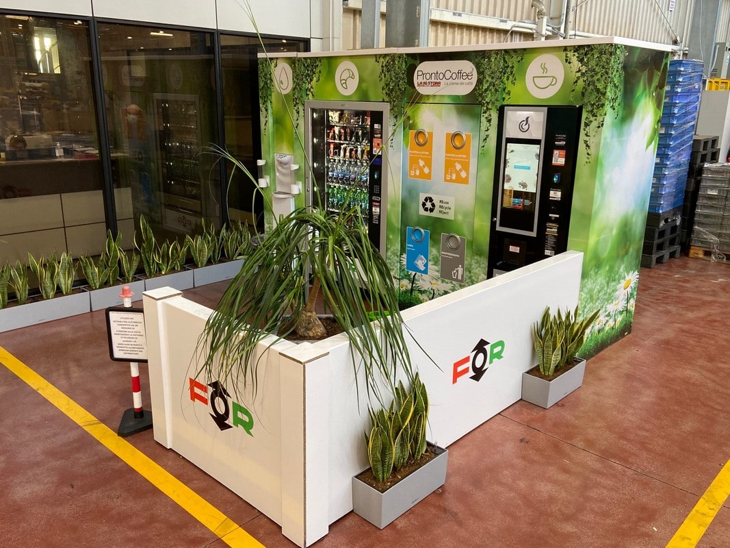 Prontocoffee è un importante operatore nel settore della distribuzione automatica e ci ha contattato per creare un’area break in cartone molto particolare. La richiesta arrivava da FOR, leader mondiale nella produzione di raccordi oleodinamici, e l’esigenza era quella di ricavare all’interno degli spazi aziendali un corner che consentisse ai dipendenti e agli ospiti di concedersi una pausa caffé in un ambiente fresco e gradevole. I progettisti di Natur Design hanno quindi realizzato una grande parete con strutture d’alloggio per ospitare vari distributori automatici: grazie ai rivestimenti per distributore automatico siamo stati in grado di dare un aspetto ordinato e personalizzato alla composizione, inglobando 5 distributori (acqua, snack e caffé) e integrando anche un differenziatore per incentivare il riciclo dei rifiuti. Abbiamo poi creato una parete pensata per affiggere le comunicazioni aziendali e due basse paretine che andassero a delimitare lo spazio per il break. Il risultato è un ambiente creato ex novo, interamente arredato con il cartone, ordinato, funzionale e personalizzato con una coerenza grafica che sottolinea il branding e l’attenzione alla sostenibilità dell’azienda.