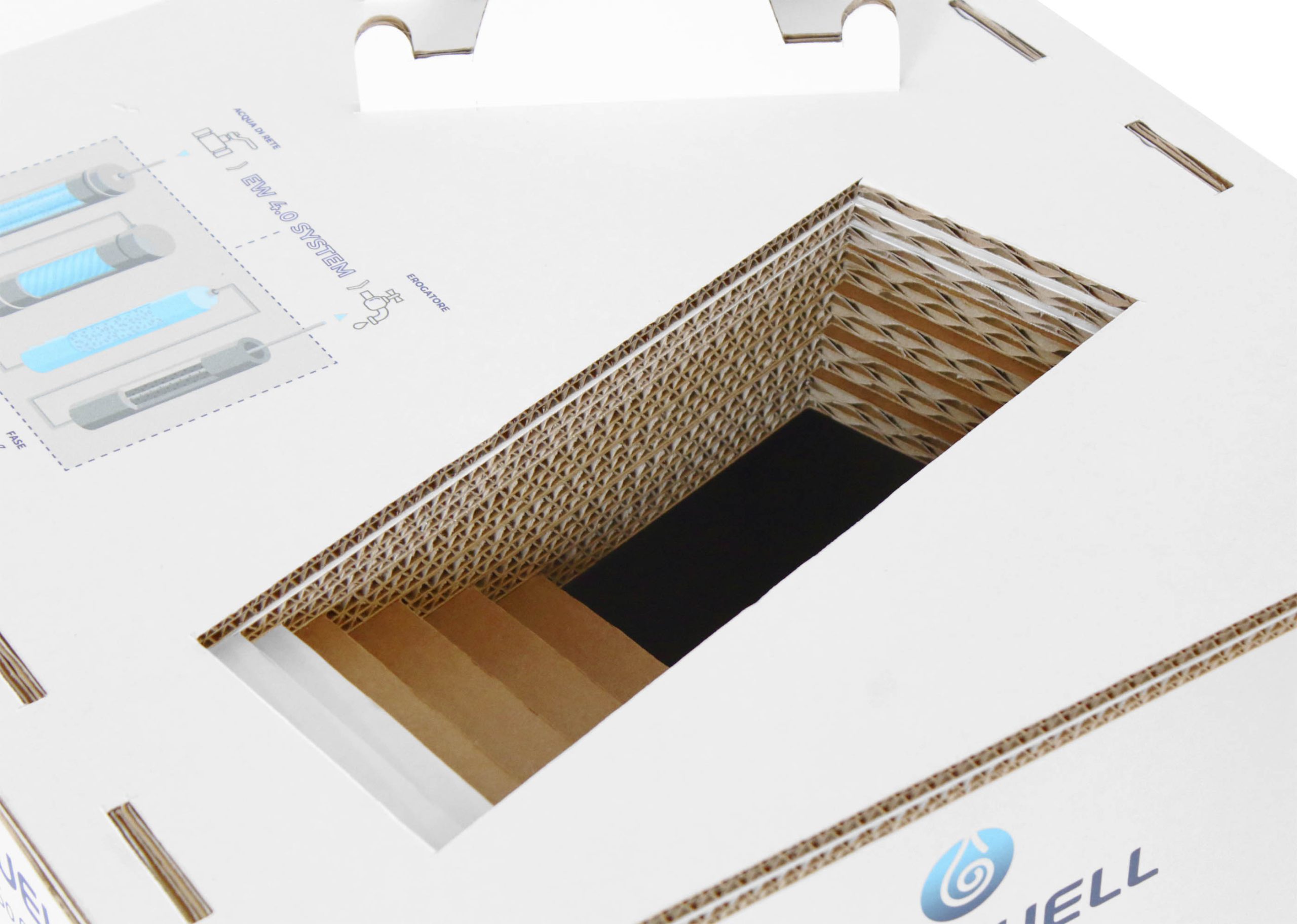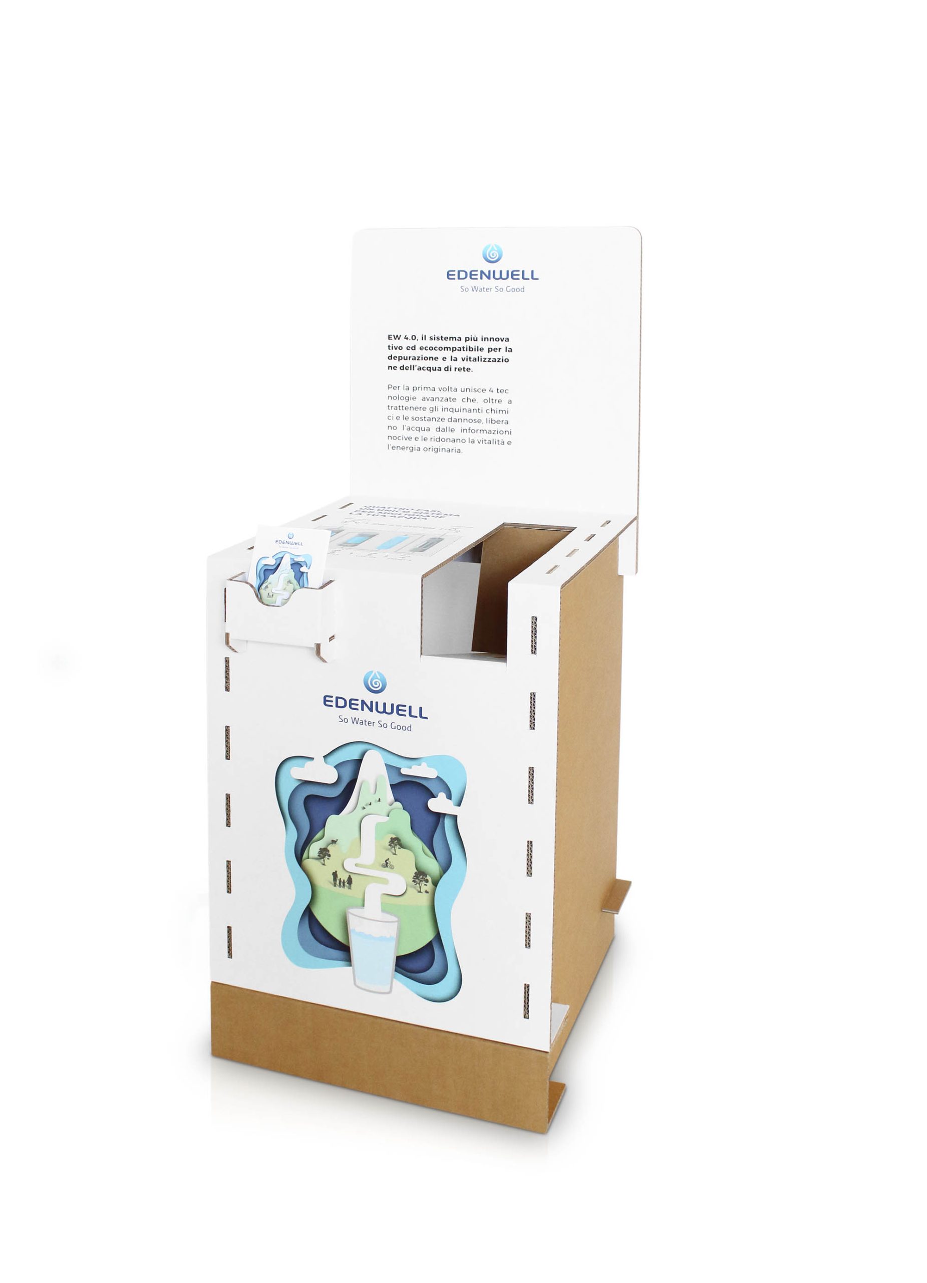 É stato perciò naturale, per affinità di intenti, realizzare un prototipo di espositore in cartone che fungesse da supporto al loro dispositivo di depurazione. Siamo partiti da una base rettangolare in cartone a tripla onda con finitura bianca che si incastrano attraverso un sistema di baionette tagliate su misura. Abbiamo però realizzato due diversi modelli di ripiani, con le stesse funzionalità ma fruibili in due diverse maniere. Nel primo prototipo il piano è lineare con un foro su misura nel quale posizionare il depuratore VITA e di fianco un sistema porta depliant, pratico e funzionale. Nel secondo modello il pannello centrale è stato realizzato in modo tale da formare un piano sagomato con uno scanso intagliato per alloggiare il depuratore. Inoltre è  stato posizionato un pannello espositore che parte dalla schiena sul quale stampare le informazioni sul sistema, il porta depliant in questo caso è posizionato sul pannello frontale. L’intero espositore in entrambi i prototipi è completamente personalizzabile con stampe ecologiche.