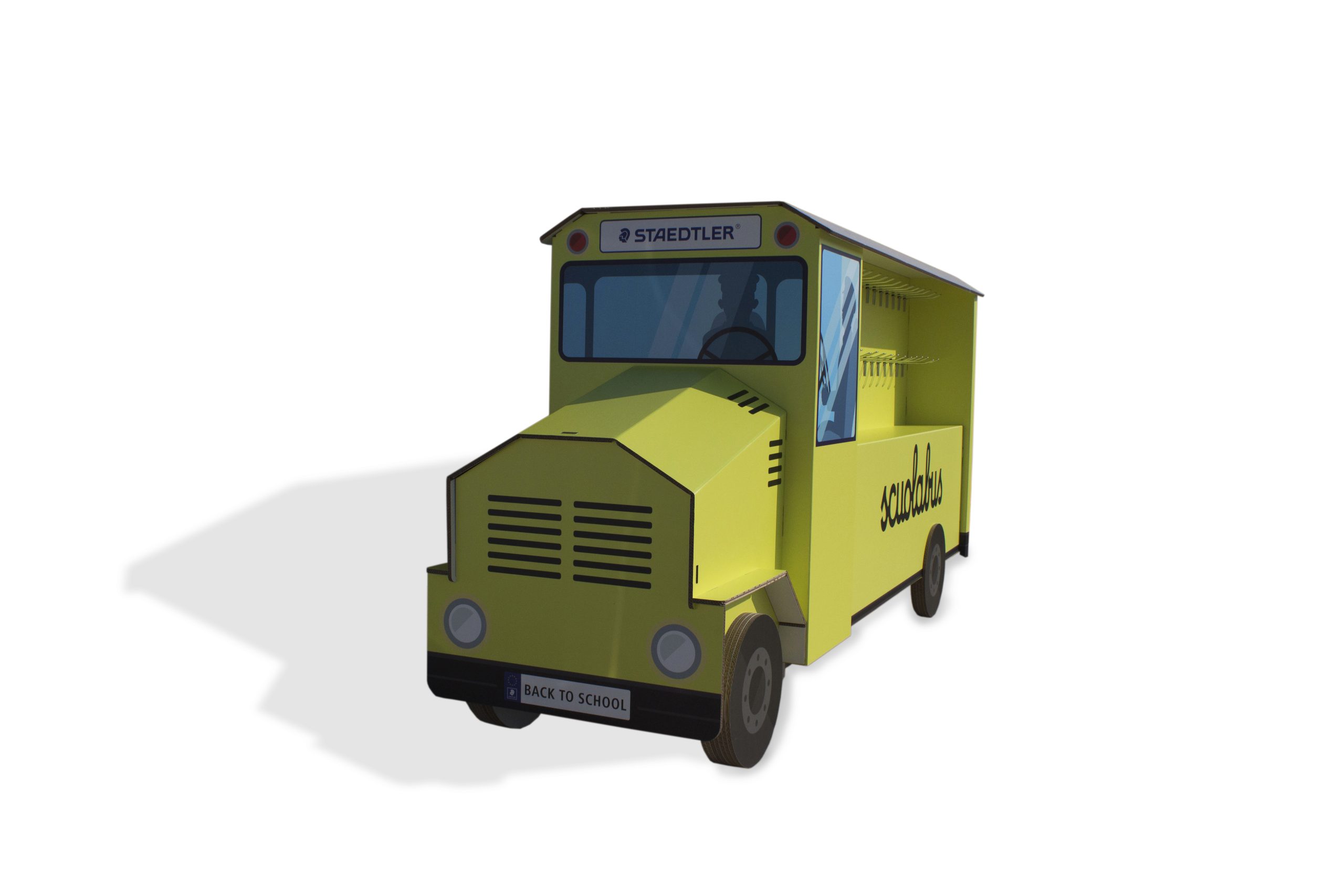 Per un evento hanno agli esperti di Natur Deisgn commissionato la realizzazione di un espositore su misura in cartone a forma di Scuolabus. Lo abbiamo così realizzato sagomando pannelli di cartone naturale con certificazione ignifuga, stampati col mitico colore giallo e assemblati tutti manualmente. Sui pannelli frontali e sul retro sono state realizzate delle stampe a figurare i verti dell’autobus con la sagoma dell’autista che si intravede e sui fianchi di questo scuolabus sono stati inseriti una serie di ganci porta blister per esporre la cancelleria.