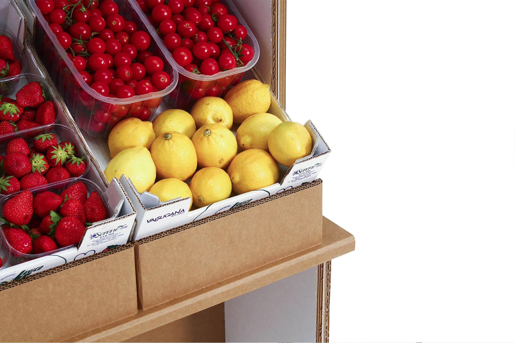Abbiamo messo a punto delle soluzioni sostenibili per l’esposizione della merce anche in campo alimentare. L’espositore in cartone banco frutta è una di queste. Dalla progettazione alla realizzazione quella di Natur Design è una proposta naturale e funzionale che permette di mostrare al pubblico la frutta in maniera originale e funzionale. Abbiamo pensato ad un banco con tre scomparti fissati su una base sormontata da una copertura smerlata che richiama la forma di una casa o di una piccola bottega. Il solido sistema di progettazione permette di esporre merce con carichi notevoli senza che la struttura portante ne risenta assicurando così una esposizione in tutta sicurezza. Il banco frutta oltre ad essere ecologico è anche completamente personalizzabile per garantire un’accattivante comunicazione dei valori del brand aziendale. Tutte le superfici infatti sono stampabili con immagini ad alta definizione. L’espositore in cartone su misura è solo uno dei tanti modi in cui si può usare il cartone per creare forme versatili e funzionali al lavoro delle aziende con il valore aggiunto dell’impatto zero sull’ambiente.