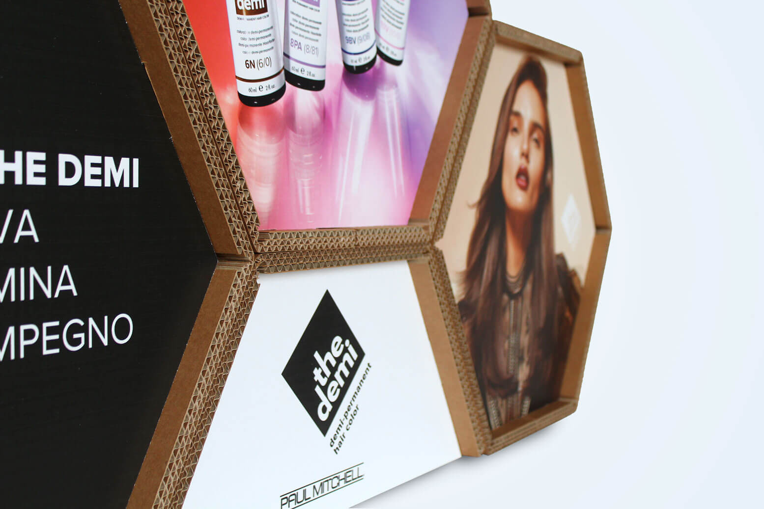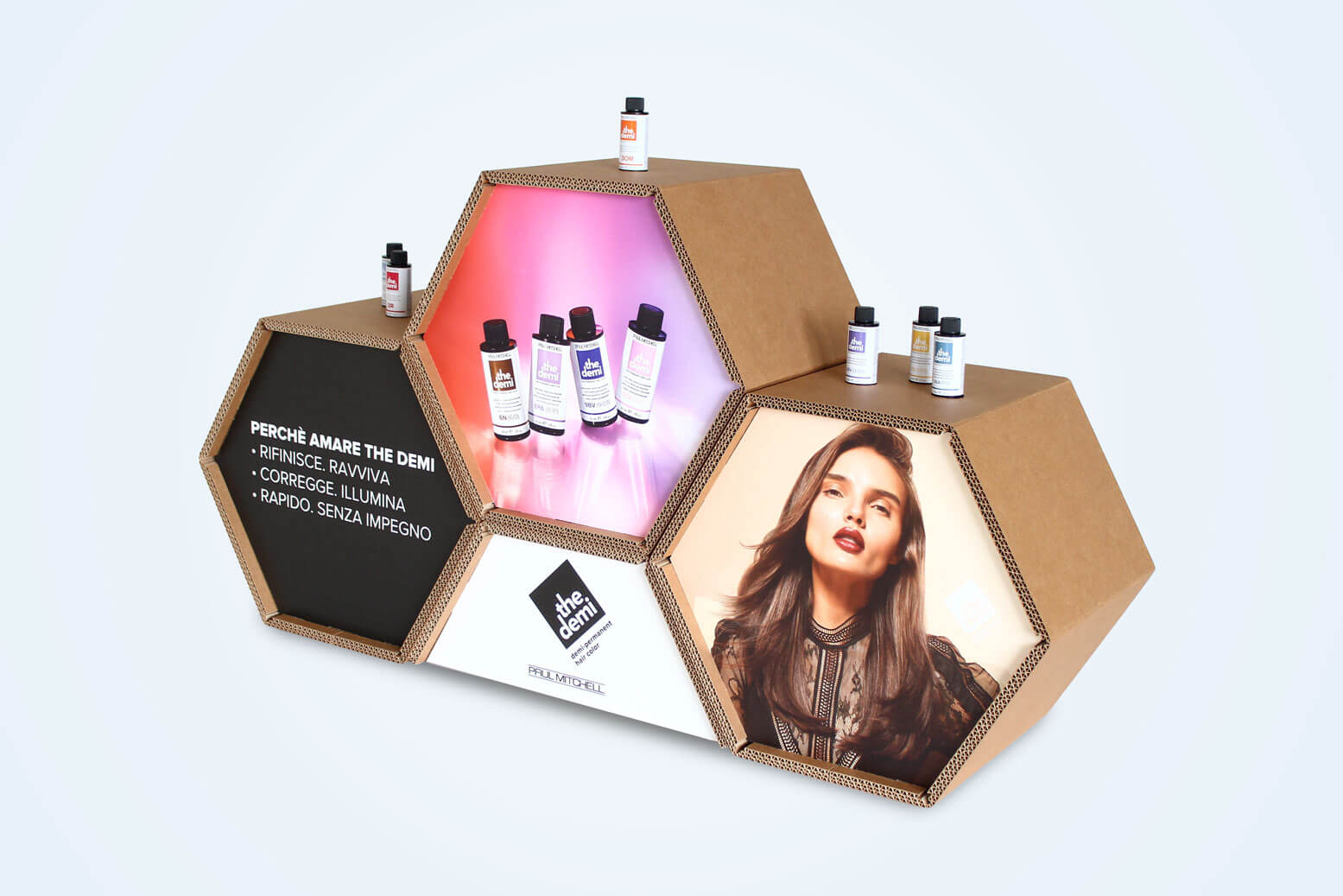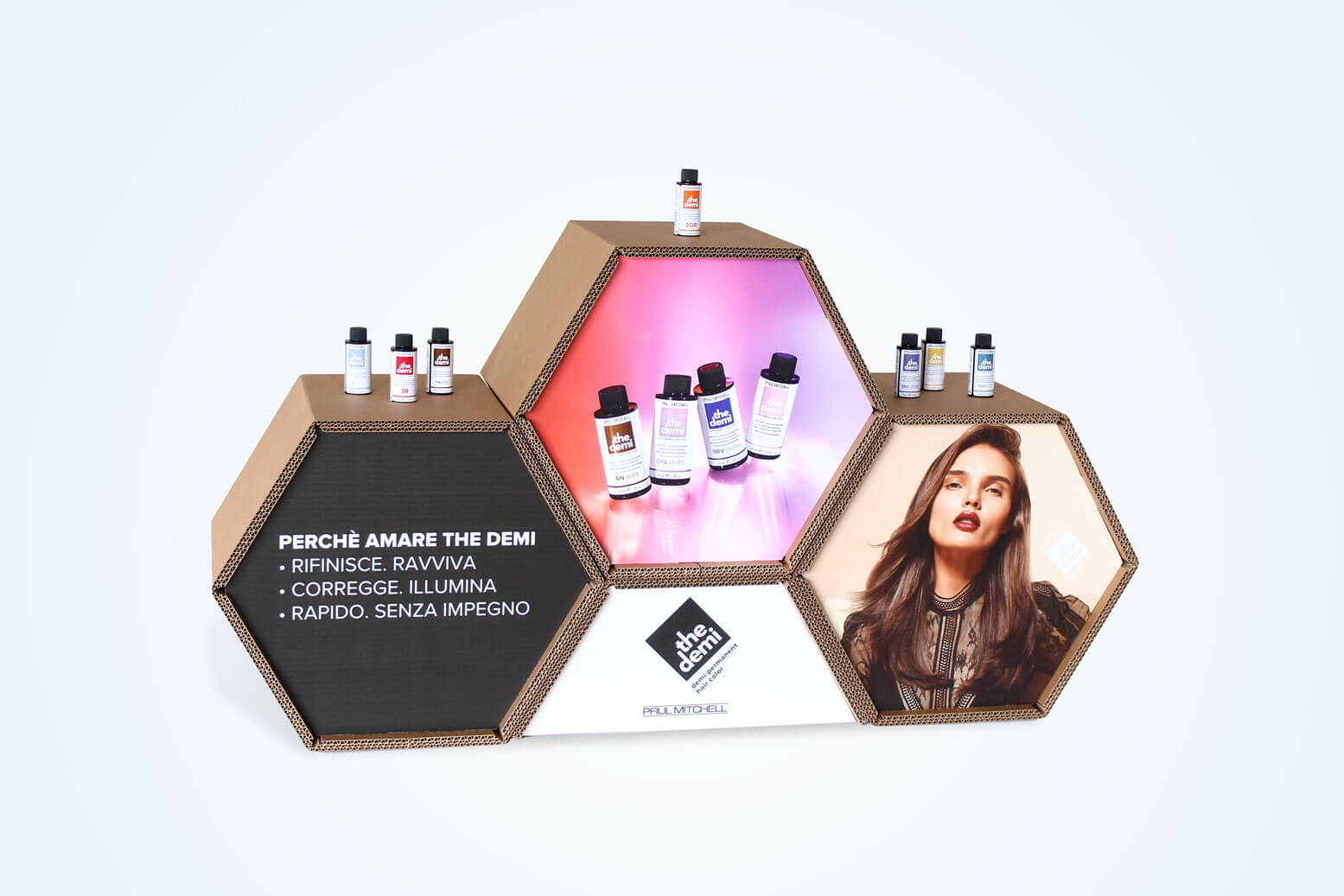 Paul Mitchell è uno dei brand più importanti nella vendita di prodotti professionali per la cura dei capelli e ha deciso di affidarsi alla creatività di NaturDesign per realizzare una serie di espositori in cartone su misura che sapessero mettere assieme innovazione e sostenibilità. Così sono nati vari prototipi connessi a diversi progetti, alcuni caratterizzati da un design esagonale modulare, caratteristica fondamentale per adattarsi alle dimensioni disponibili nei saloni di bellezza in cui andavano inseriti. Altri componibili, con un gioco ad incastri in stile tetris molto creativo e divertente. Altri ancora richiamavano le forme di un albero, con un ulteriore richiamo alla natura. Tutti gli espositori sono stati concepiti per essere molto facili da montare, leggeri e compatti da trasportare e personalizzabili con grafiche ad alta definizione. Il rapporto di collaborazione con il marchio Paul Mitchell continua da anni, all’insegna di uno scambio stimolante di idee.