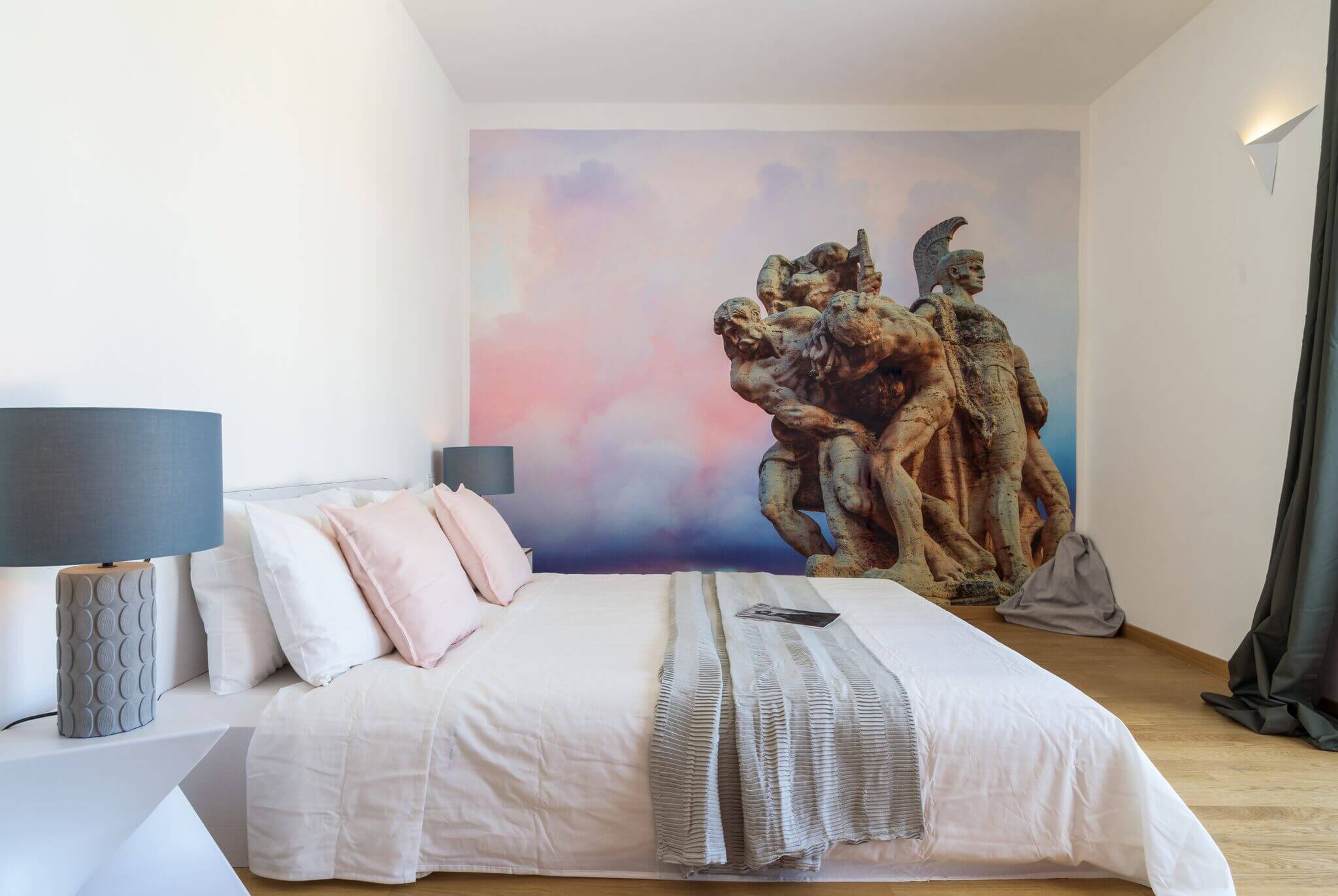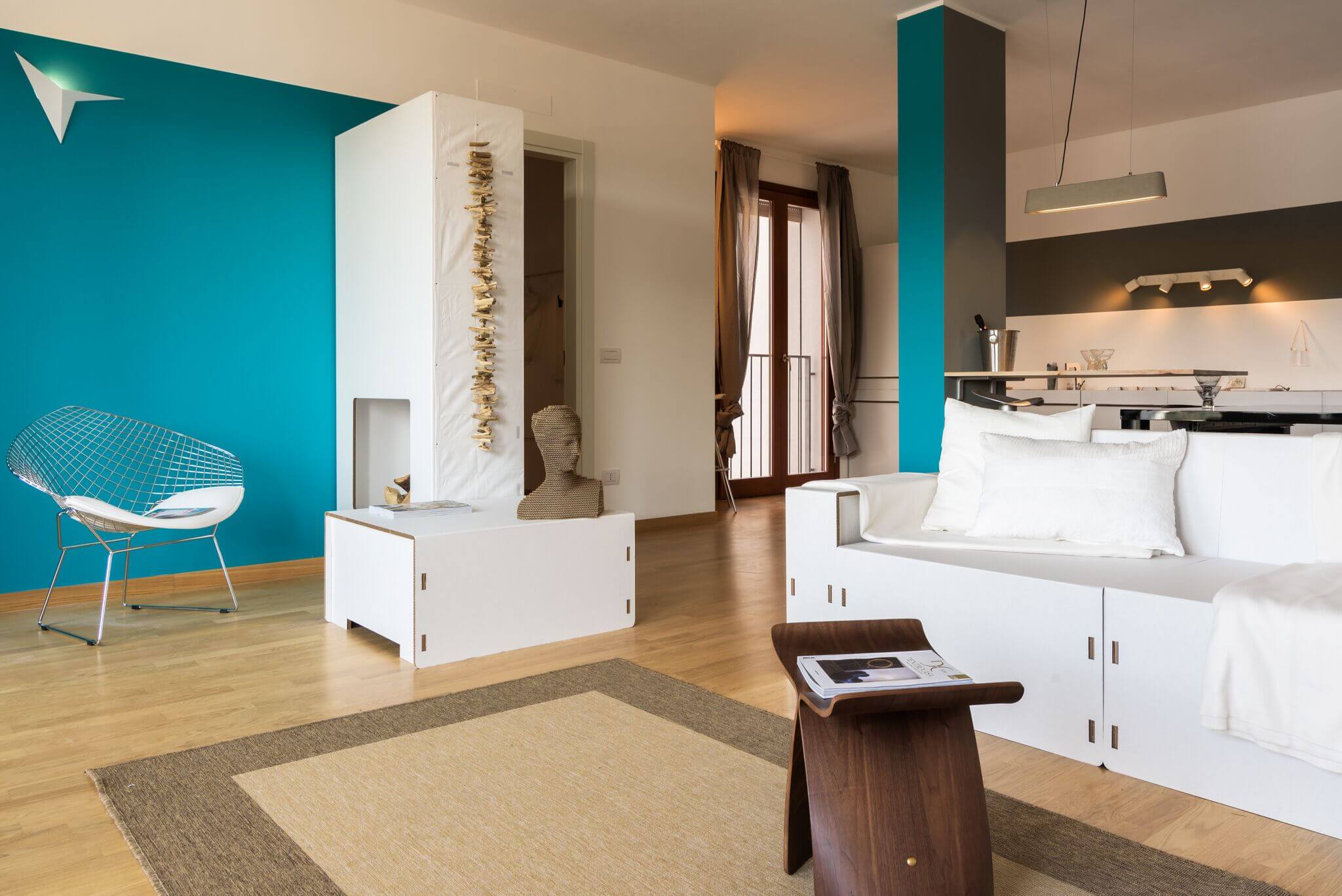 Per la zona living è stata allestita usando una cucina bianca in cartone della linea Lia  per dare l’effetto di uno staging dinamico e trendy adatto ad un target giovane di potenziali clienti. I moduli componibili delle nostre cucine in cartone consentono di creare messe in scena efficaci e funzionali centrate sui volumi dei locali. Lisa ha inoltre inserito un tavolo in cartone a completamento dell’atmosfera familiare dell’area living. La scelta stilistica decorativa è poi caduta su una palette di colori pastello che risaltano il bianco dei mobili conferendo luminosità contrastato da grandi stampe al muro dai colori più dark per dare carattere all’ambiente. La zona living continua in soggiorno allestito con divanetti in cartone con struttura nuda ravvivati da morbidi cuscini. Spostandoci nella zona notte incontriamo un’armadiatura a muro capiente e funzionale e la camera da letto arredata con una struttura per letto dalla testiera arrotondata.