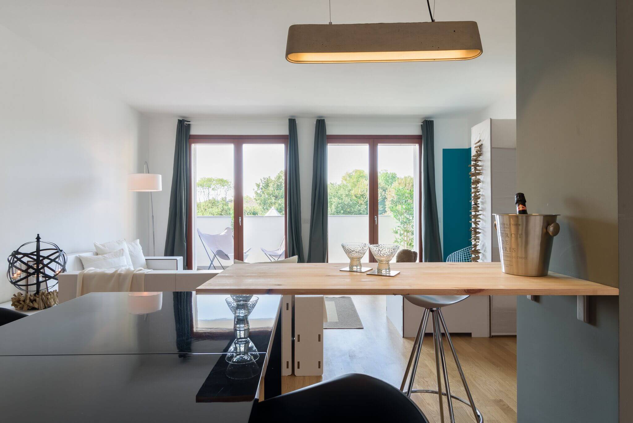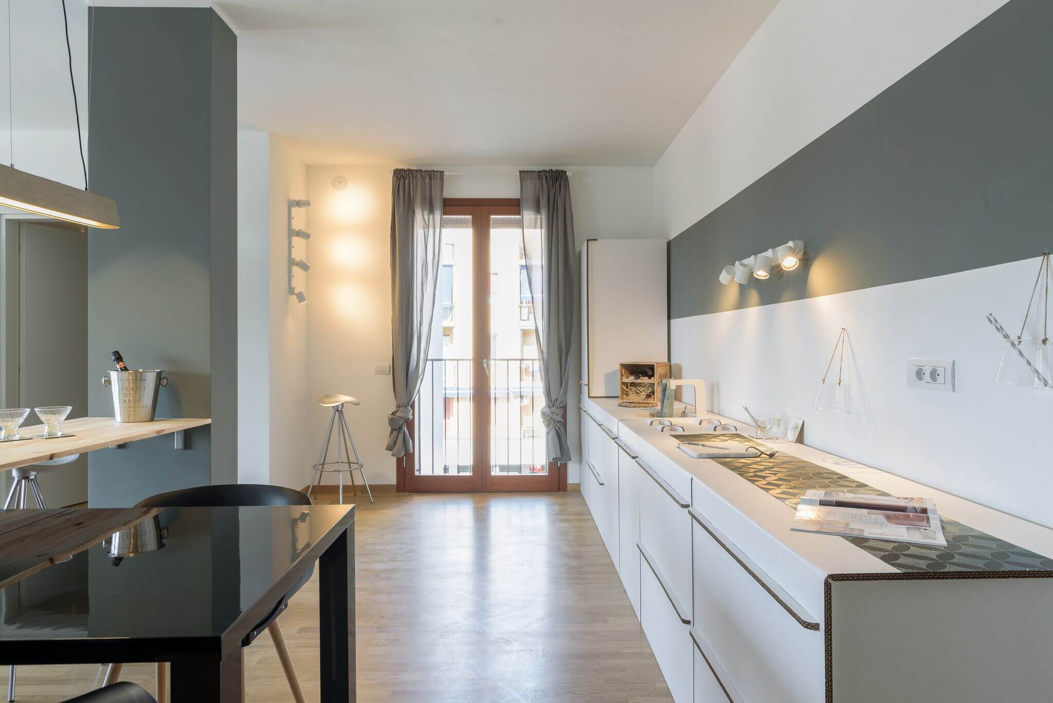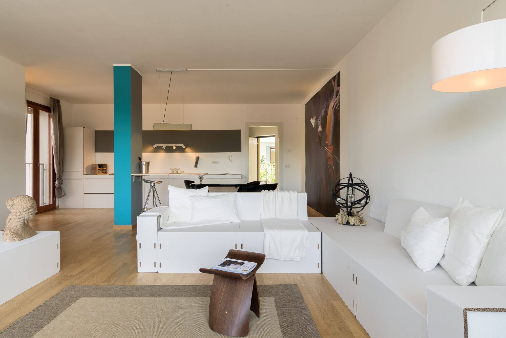 Lisa ci racconta che quando si progetta un allestimento per residenze private l’approccio al lavoro è molto diverso rispetto ad altri interventi perché bisogna tener conto dell’aspetto dei gusti, dei desideri delle preferenze dei potenziali clienti. Si parte di solito da una base neutra che possa adattarsi ad ogni ambiente e stile e poi si gioca sui dettagli e sugli arredi che colorano l’atmosfera e riempiono lo spazio simulando gli ingombri di un reale arredamento. L’allestimento che è stato realizzato in questa residenza cittadina dallo stile architettonico lineare e moderno ha tenuto conto di una metratura non proprio ampia ma molto luminosa adottando uno stile semplice ma chic.