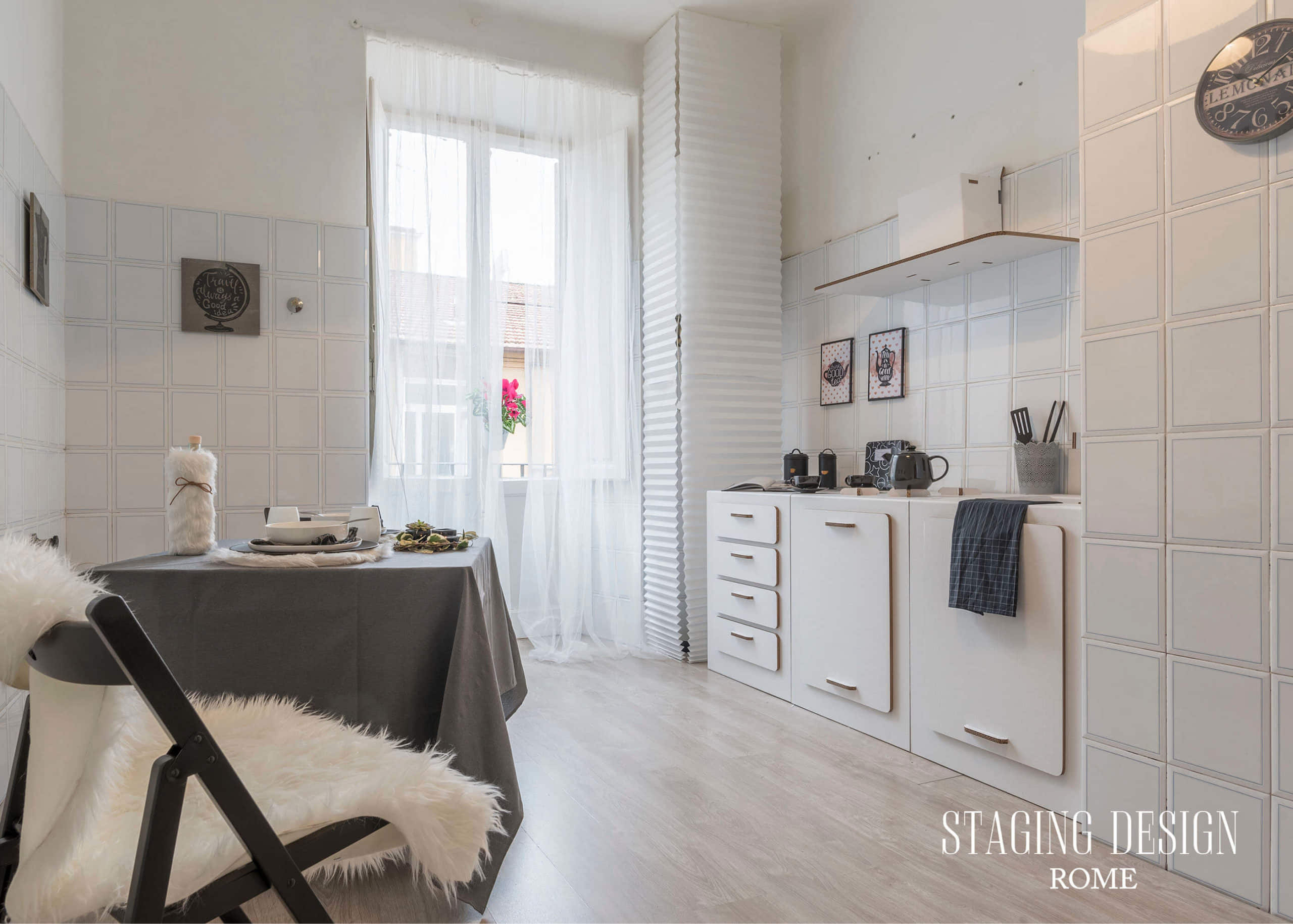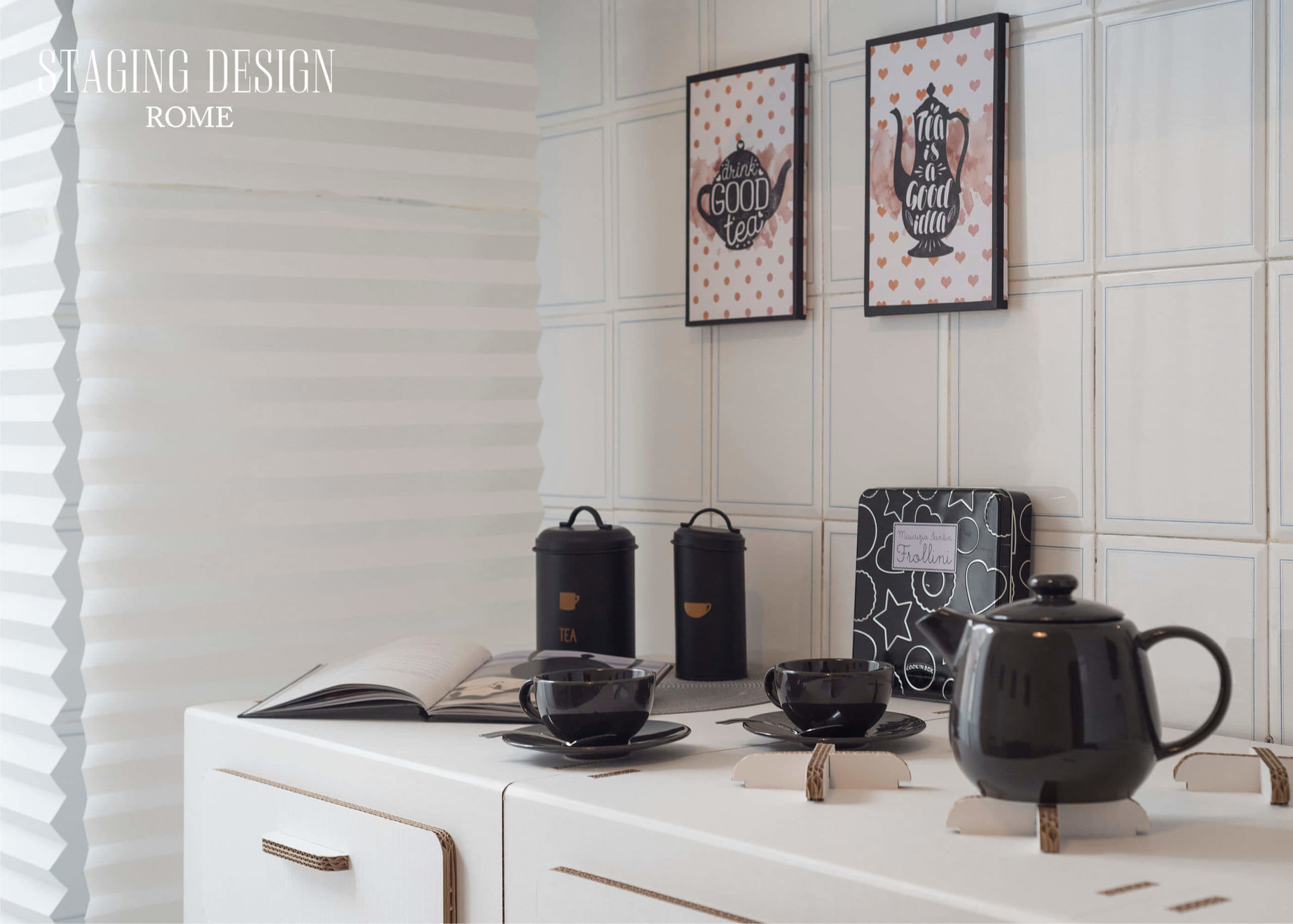 Ed è proprio nella capitale che Chiara ha realizzato questo allestimento dal gusto romantico e stiloso allestendo la zona cucina ed il soggiorno con gli arredi in cartone naturale per Home Staging progettati  da Natur Design.
