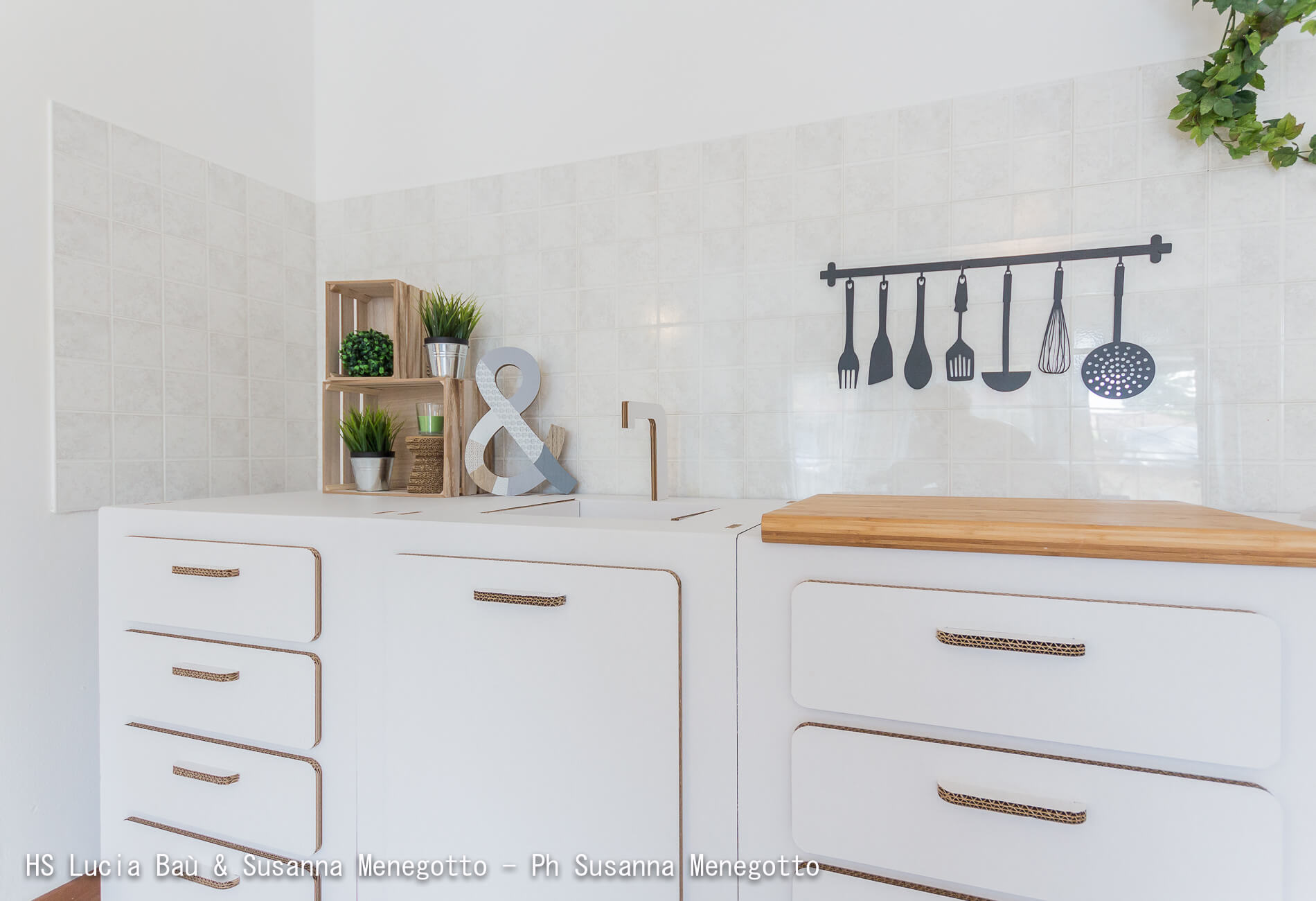 Prendiamo ad esempio la nostra cucina Gioia. È una proposta modulare dalle linee tradizionali ed eleganti che si adatta anche ad ambienti più moderni creando un mix armonioso di stili. Nelle foto questo effetto è reso molto chiaro dall’home staging di Susanna Menegotto, sia nelle composizioni a parete intera che nell’arredo di singole aree con singoli moduli. Il colore chiaro con gli inserti nella finitura naturale del cartone, abbinati ai colori tenui del pavimento e delle mura, alleggerisce gli ambienti creando atmosfere accoglienti ed ariose. Dalle impostazioni architettoniche più classiche a quelle più moderne i mobili per home staging per la cucina in cartone si adattano perfettamente senza bisogno di avere tante soluzioni a magazzino. Sono moduli sostenibili, leggeri da trasportare e facili da montare, ideali per home stager dinamici e con una visione che va dritta al punto.