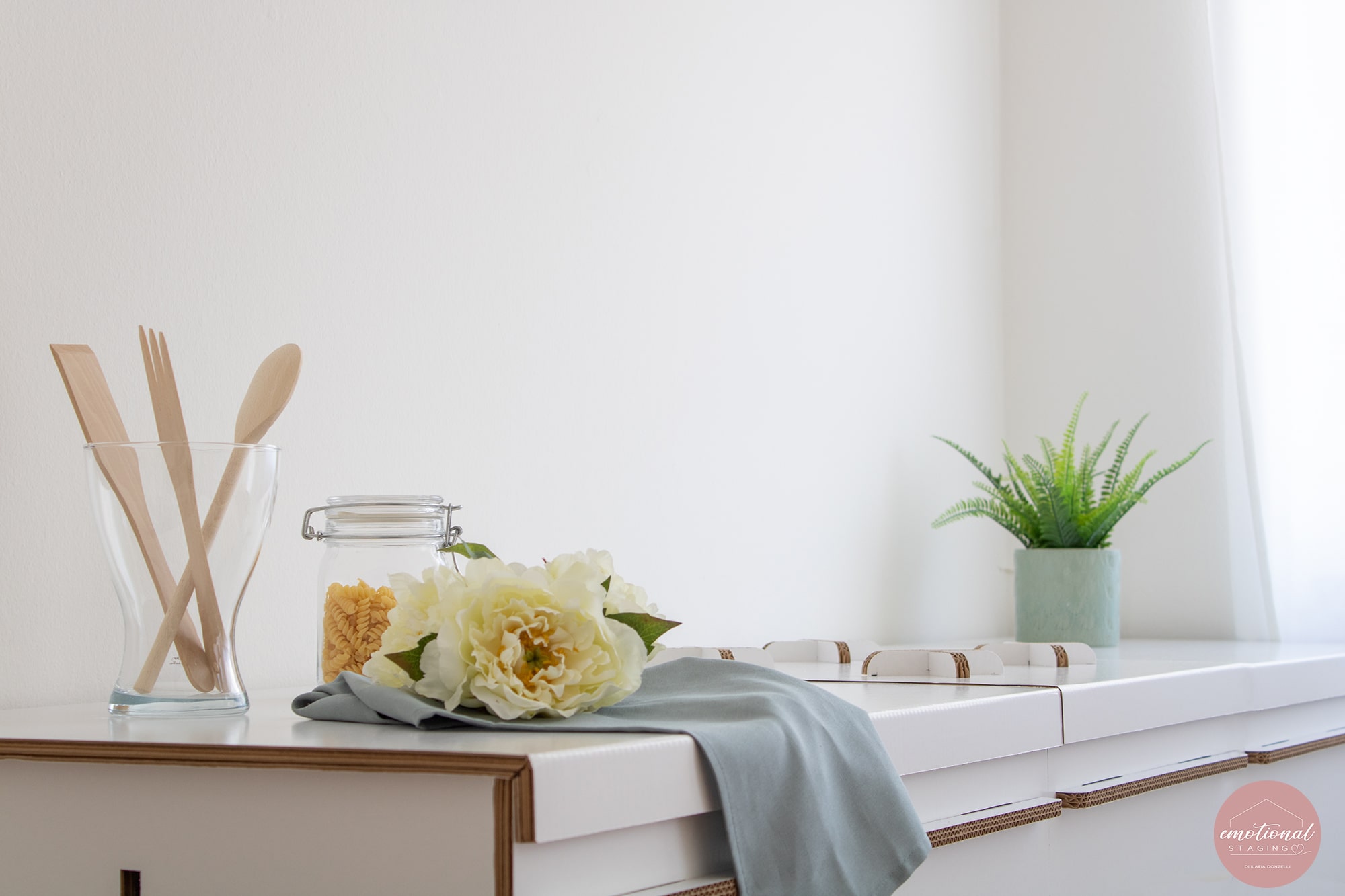 Gli interventi di Home Staging di Ilaria Donzelli sono studiati nei minimi dettagli: questo significa che dietro ogni foto si nasconde un lavoro complesso, fatto di piccole scelte, dai materiali agli arredi, passando per i tessili e le decorazioni. Alla base c’è una cura speciale delle case allestite, che di riflesso diventa una cura dei possibili clienti che vivranno questi locali. Nelle foto sopra l’allestimento homestaging del locale prevedeva diversi mobili in cartone ad uso dimostrativo: nella zona giorno si possono notare il sofà e il divanetto in cartone che ricreano il comfort di un salotto ad alto tasso di relax. La cucina è allestita con un modulo lavandino e uno fornelli della linea Lia, posizionati uno di fronte all’altro. Nella zona notte infine un comò a cassettiera in cartone dà un tocco elegante alla stanza. L’appartamento si trova in provincia di Como e il servizio fotografico è stato usato come campione per la vendita di altri 4 altri locali analoghi per caratteristiche e metratura, tutti siti nella stessa palazzina. Le nostre proposte sono soluzioni intelligenti, sostenibili e funzionali per un Home Staging di successo.