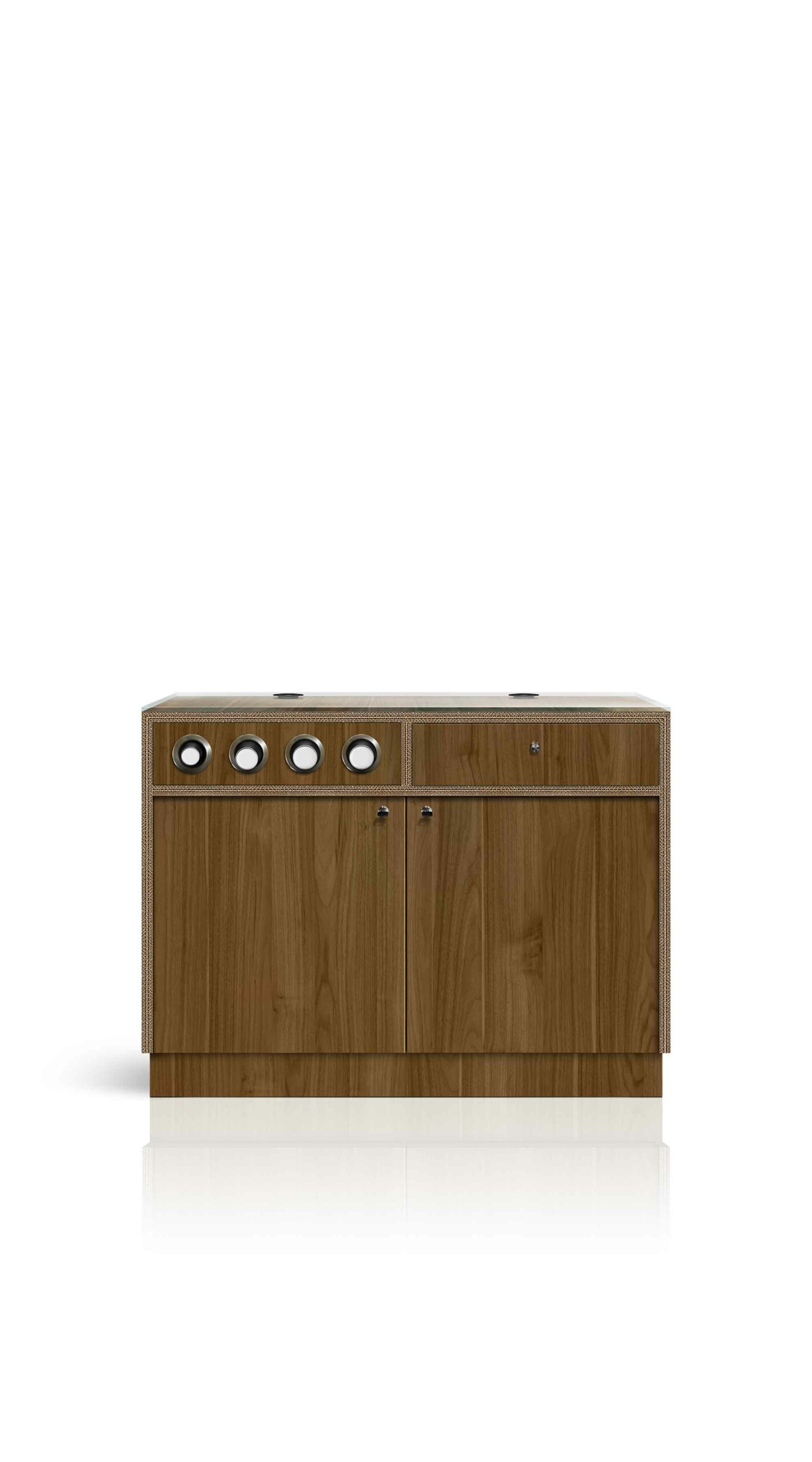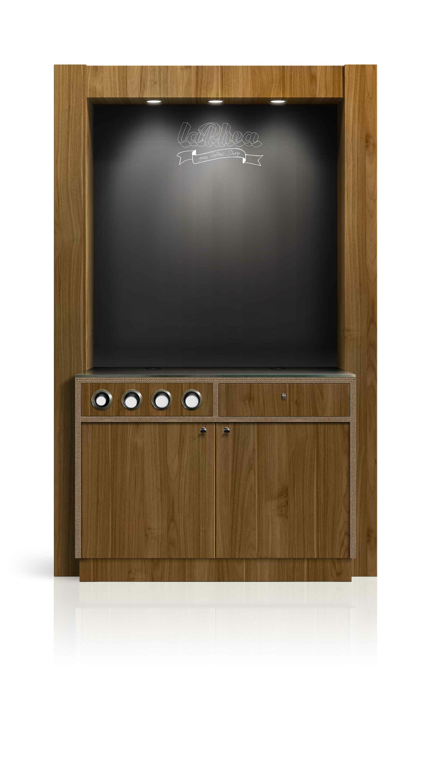 La superficie esterna può essere stampata letteralmente con qualsiasi cosa, dai colori aziendali al menu dell’area break offerta agli ospiti. Perfetto per un pop-up store in cui comunicare il marchio è una priorità assoluta. Ha un distributore di bicchieri integrato, un cassetto per utensili e condimenti e due ampi armadietti per la conservazione dei rifiuti. Il controsoffitto può essere richiesto in vetro e dotato di faretti a led opzionali.