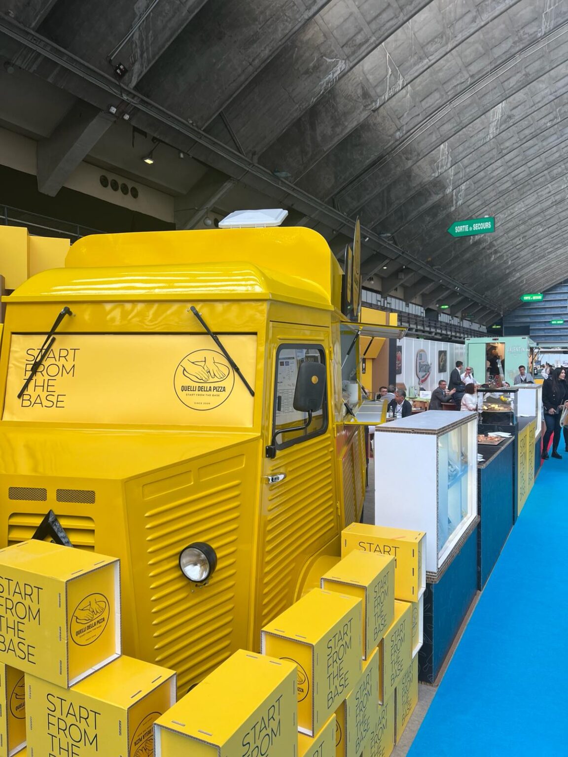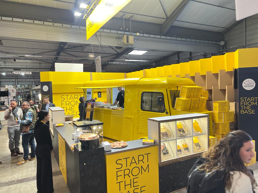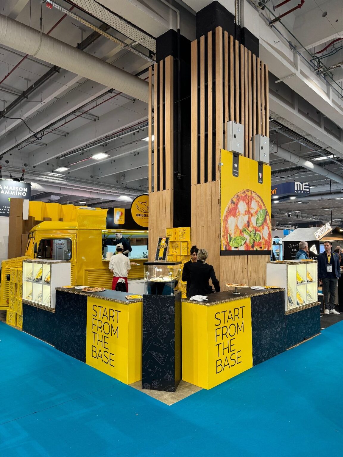 Il cuore dello stand era rappresentato da un food truck con finestra a vista da cui venivano sfornate pizze in tempo reale circondata da un’originale sala di assaggio. Questa vetrina culinaria ha catturato l’attenzione dei visitatori, offrendo loro la possibilità di gustare direttamente le prelibatezze di Quelli della Pizza. Di fronte al food truck, un banco di assaggio invitava i visitatori a degustare le pizze realizzate con la gamma di basi che l’azienda promuove, evidenziando l’angolo dedicato al take-away veloce.