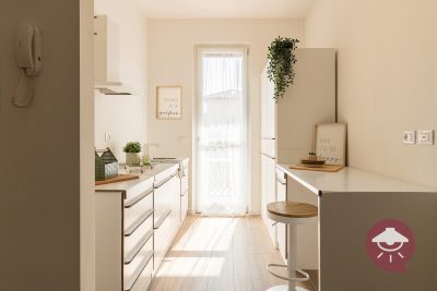 Lo staging della zona cucina è un esempio di eleganza classica e funzionale. La cucina modulare della serie Gioia in cartone naturale, è stata posizionata con cura per massimizzare lo spazio disponibile e creare un ambiente accogliente e invitante. Il modulo cottura e il modulo lavandino sono stati collocati in modo strategico per garantire una comoda e fluida preparazione dei pasti. La cappa sopra il piano cottura aggiunge un tocco moderno e pratico. Una piccola penisola con sgabelli permette di creare uno spazio per la colazione o un luogo informale per conversare mentre si cucina. Un modulo cassettiera con piano di servizio offre spazio per utensili e stoviglie, mentre una colonna con frigo e dispensa garantisce un facile accesso agli alimenti. L’atmosfera naturale è ulteriormente enfatizzata dall’uso del cartone naturale, che dona calore e carattere all’ambiente. Nonostante le dimensioni ridotte, questa cucina emana un’accoglienza familiare e invoglia a riunirsi per condividere momenti speciali in uno spazio che unisce design classico e funzionalità moderna.