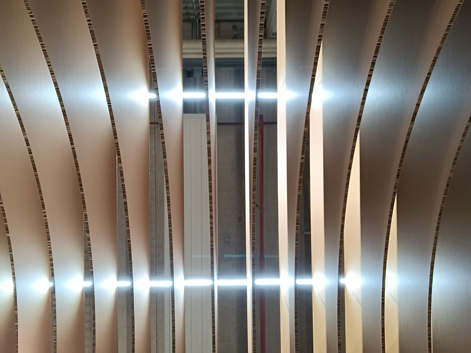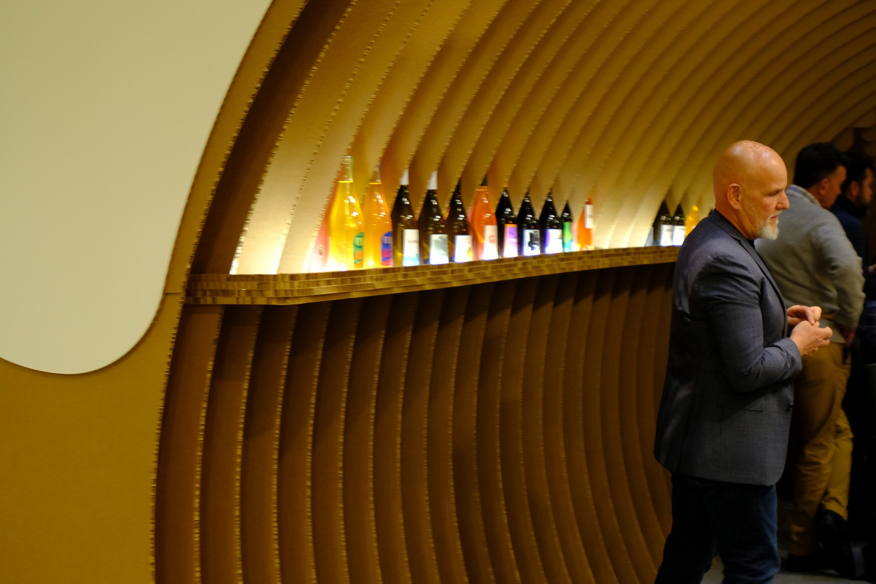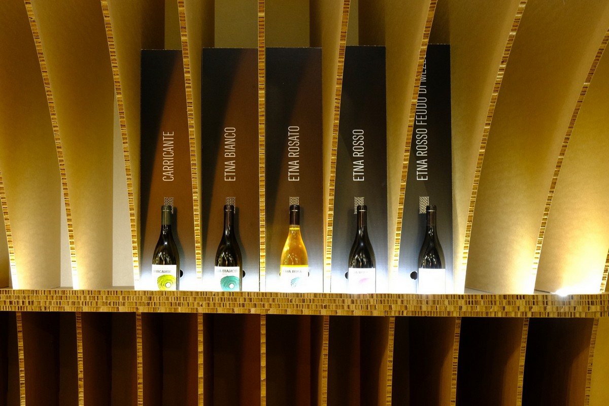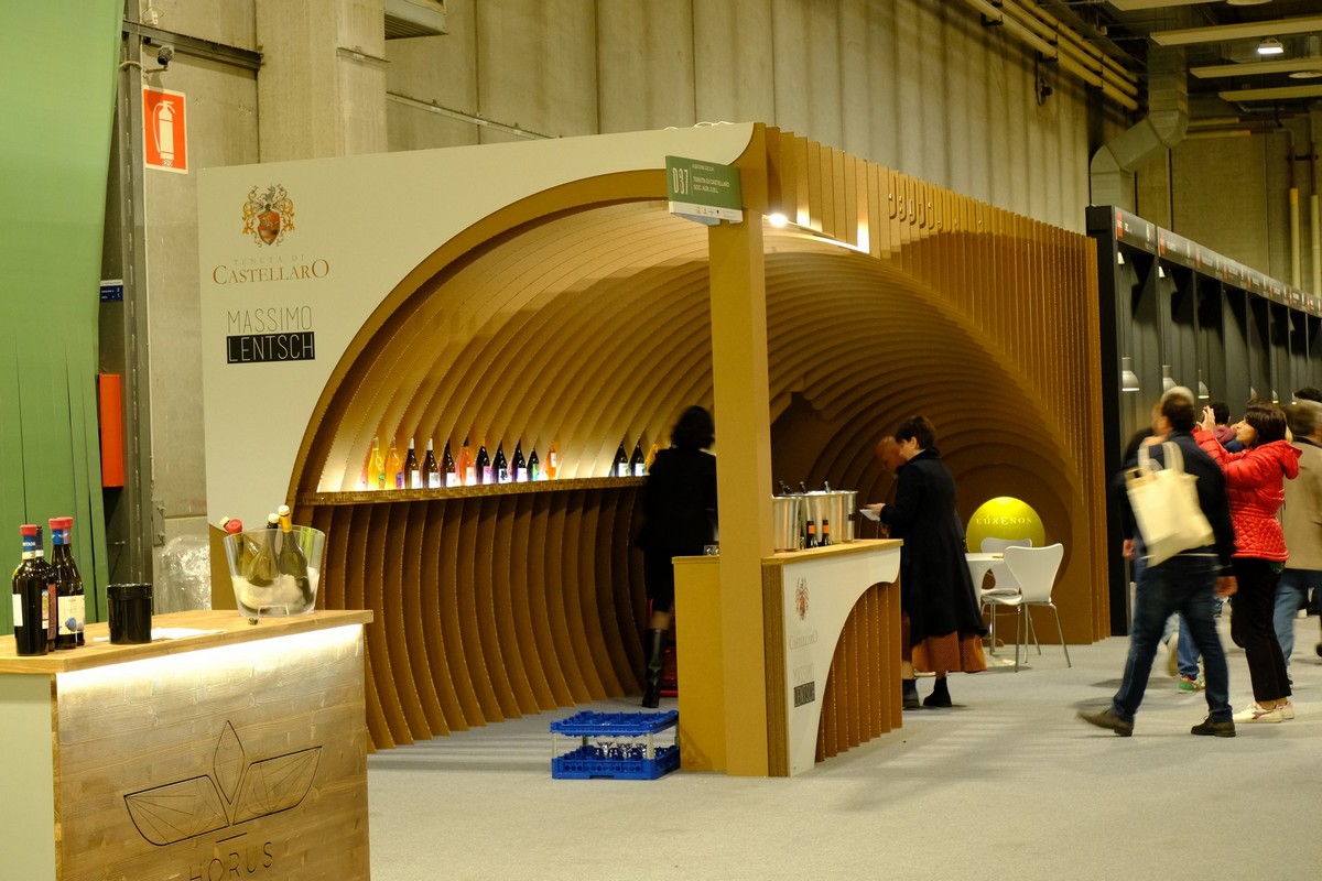 Il processo creativo di trasformare l’idea di uno stand eco-sostenibile in una forma tangibile è stato affascinante e coinvolgente, con molti attori ispirati dallo spirito ecologico degli allestimenti in cartone. Abbiamo iniziato concependo lo spazio come un blocco di materia, poi l’abbiamo immaginato tagliato in segmenti semicircolari successivi, dai quali abbiamo via via sottratto il materiale in eccesso fino a creare una sorta di cavità. Il risultato visivo è stato uno stand lungo 8 metri, che ha assunto l’aspetto di una grotta racchiusa da lame intagliate di cartone naturale. Queste lame sono state fissate su una parete di fondo, all’interno della quale sono state create nicchie retroilluminate, perfette per esporre la gamma di vini prodotti dall’azienda.