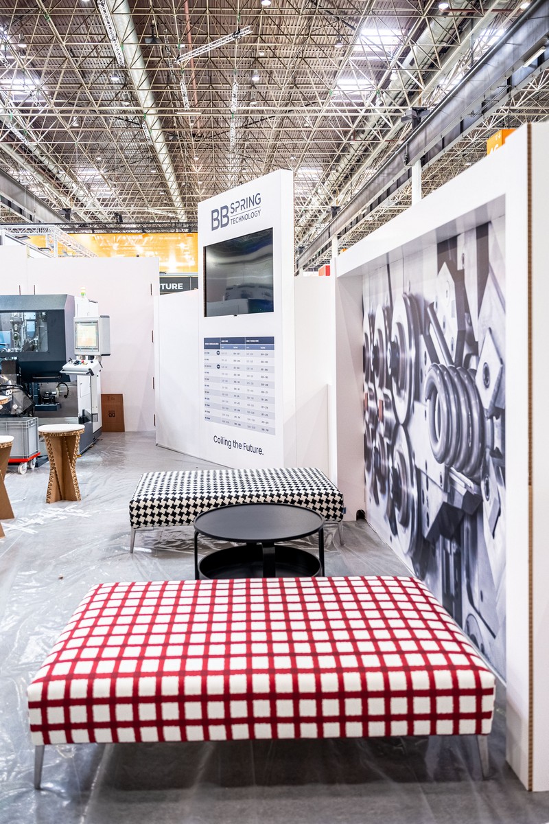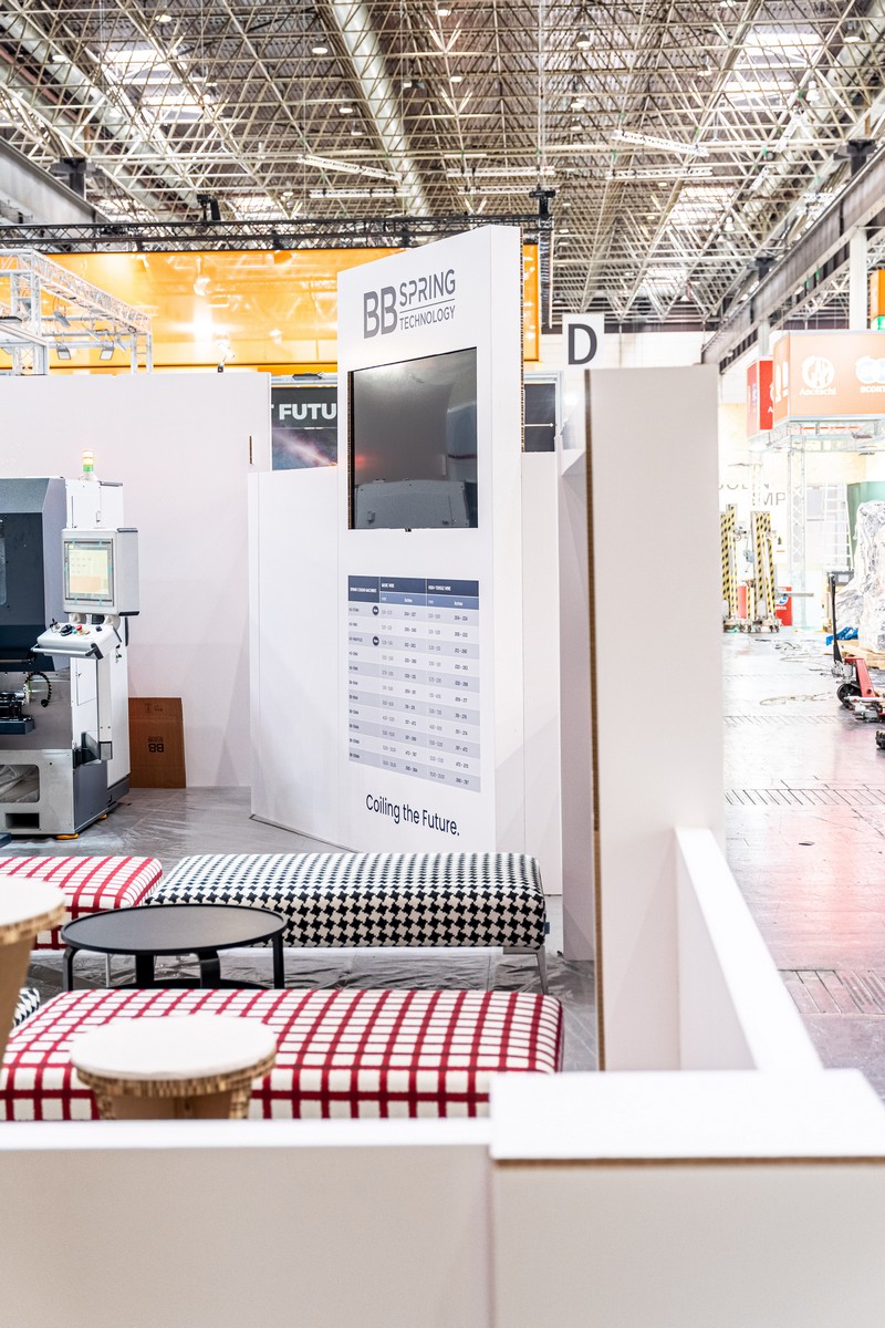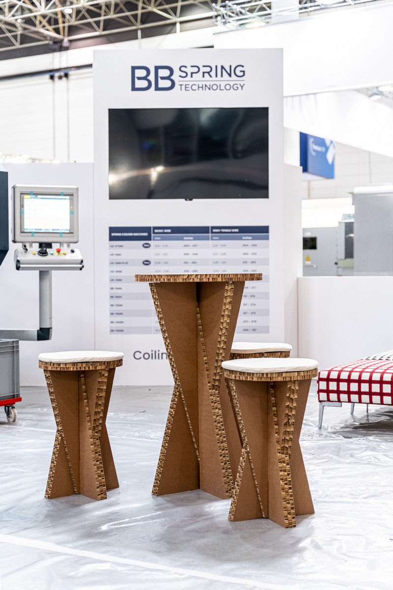 L’area espositiva, di 100 mq su area nuda, è stata progettata per esprimere al meglio la filosofia di BB Spring Technology. Circondata da muretti bassi su tutti i lati, la struttura ha sfruttato sapientemente la versatilità dell’arredamento ecosostenibile in cartone per creare un layout dinamico e coinvolgente.