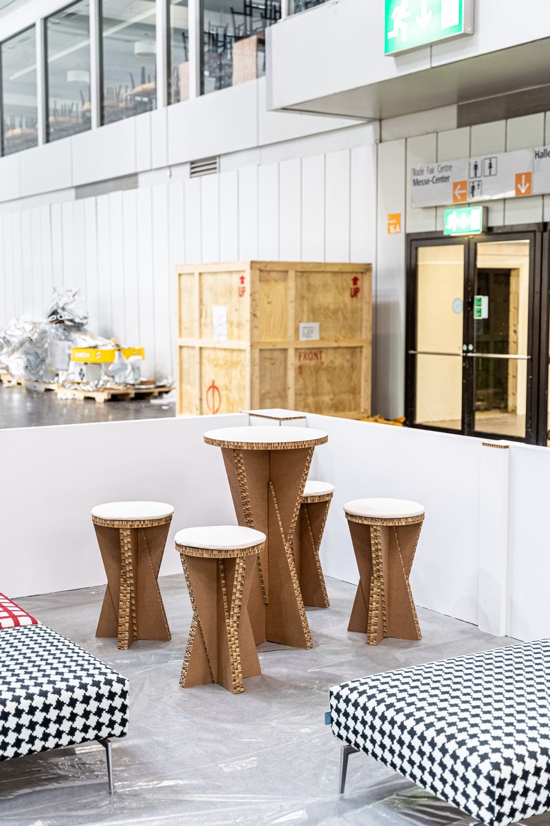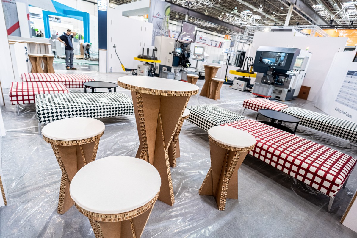 All’ingresso, un elegante bancone circolare fungeva da punto di accoglienza, invitando i visitatori a scoprire lo spazio espositivo. All’interno, i macchinari dimostrativi e gli arredi, tutti in cartone, hanno dimostrato non solo la solidità e la flessibilità del materiale, ma anche il potenziale di design ecosostenibile per il mondo delle esposizioni.