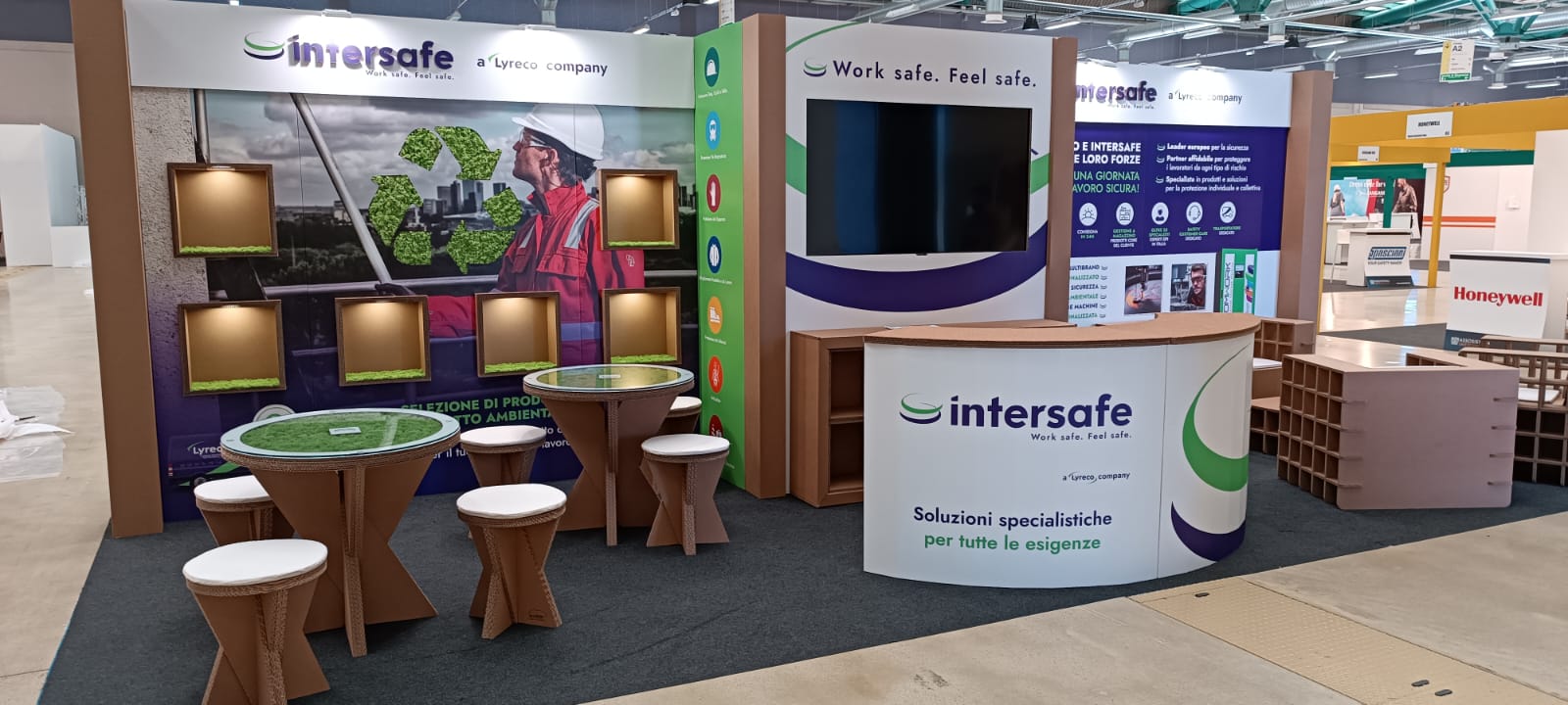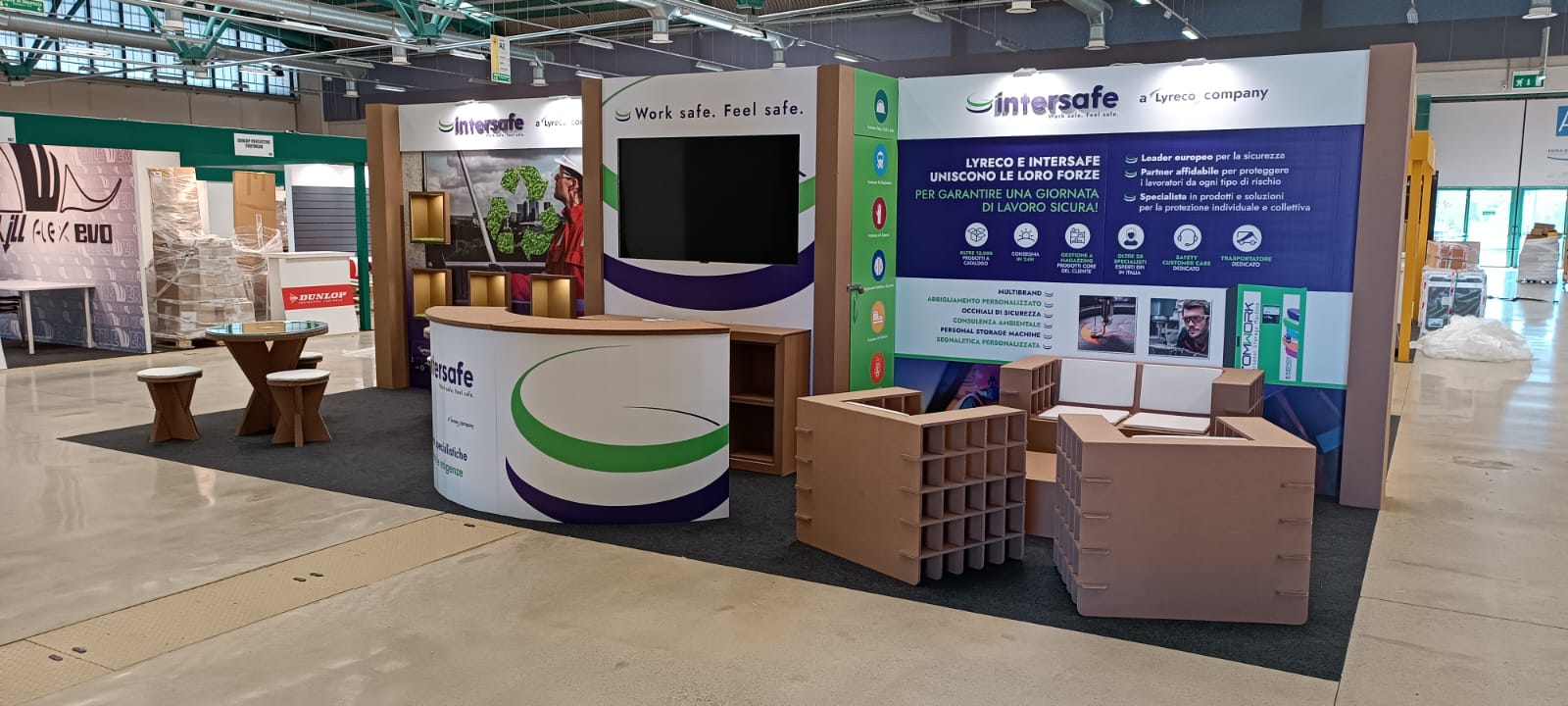 Uno stand sostenibile in cartone naturale per Lyreco Italia al Safety Expo di Bergamo per promuovere le politiche di sicurezza sui luoghi di lavoro? si può fare!