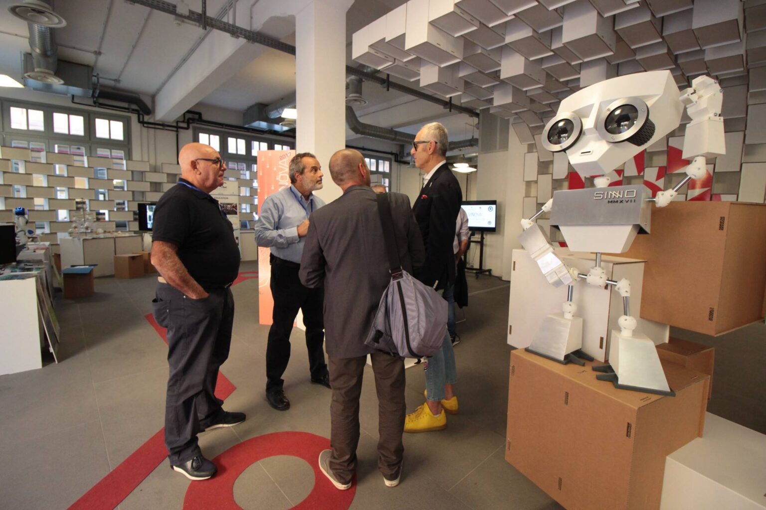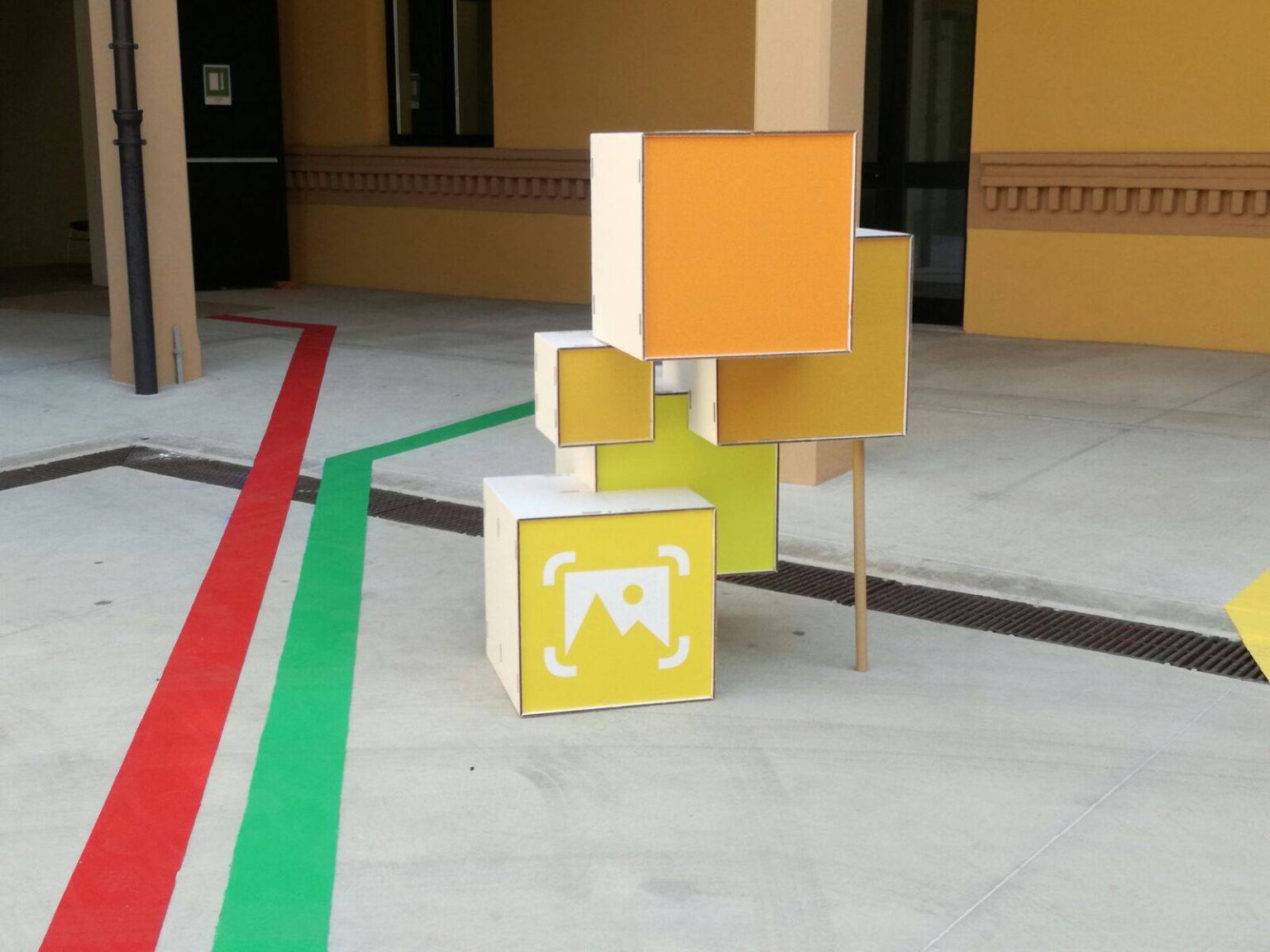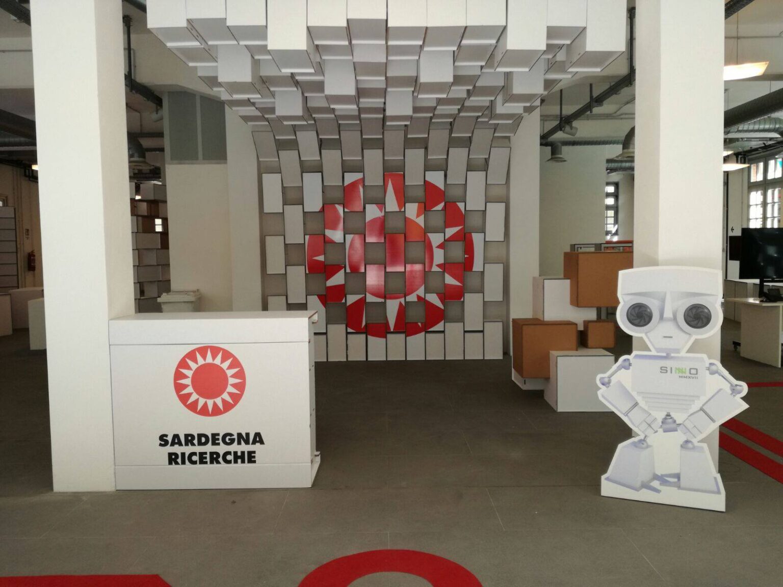 Per abbellire lo spazio sono stati infine realizzate strutture costituite da cubi incastrati e colorati, banner indicativi e cartonati del robottino mascotte della manifestazione.