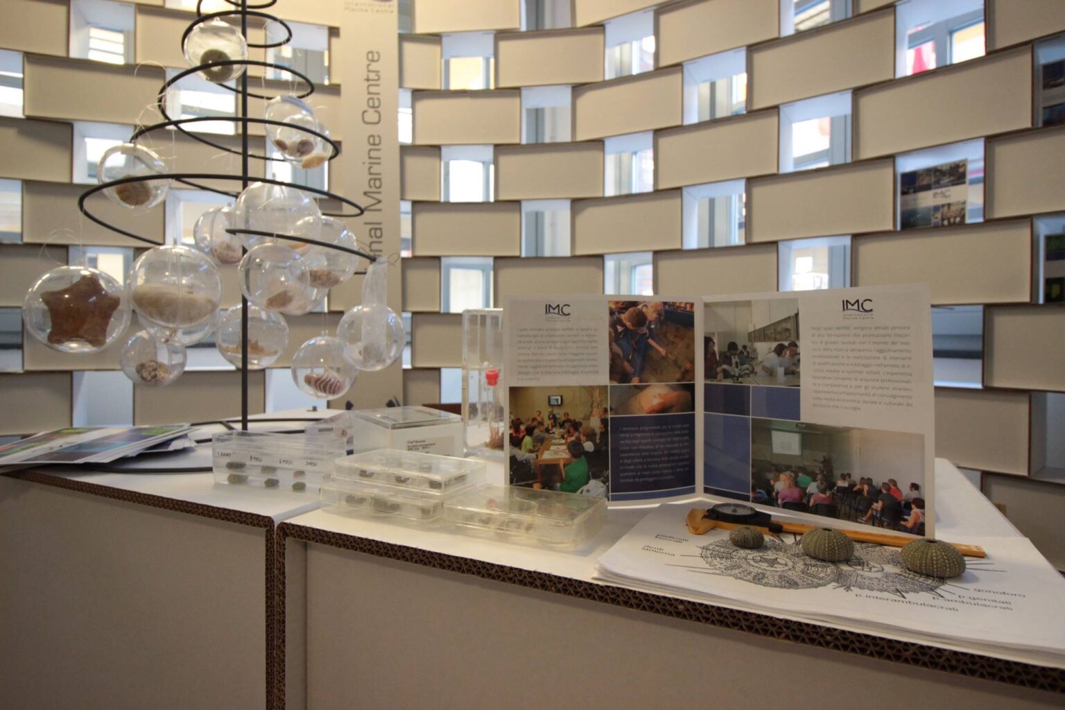 Pensare ad uno spazio che fosse sostenibile per arrivare ad un futuro consapevole dei cambiamenti in atto e di quanto sia importante fare ognuno la propria parte è stata una sfida. Si parlava di innovazione e gli attori in gioco nella manifestazione erano e sono ancora gli artefici di uno sviluppo sociale ed economico equo e giusto per tutti. Molte le università presenti e le amministrazioni locali che danno supportato i progetti per i vari settori. Abbiamo pensato perciò di dare forma ai volumi dando loro uno stile molto futurista ma mantenendo una indispensabile anima green. L’allestimento ecosostenibile copriva molte aree dello spazio a disposizione. Gli elementi più caratteristici sono state le pareti dei vari stand degli atenei della regione presenti che in alcuni casi fungevano da veri e propri sfondi in altri in semplici divisori dinnanzi alle quali sono state posizionate consolle o postazioni per l’incontro con i visitatori. In alcuni stand queste pareti curvavano nello spazio, distorcendosi in una volta di immaginifici pixel,  sullo sfondo del quale di componeva il logo aziendale. L’info point centrale in cui si accoglievano i visitatori all’entrata è stato realizzato con banconi consolle della serie Vago in cartone bianco e logo stampato della manifestazione. Le singole postazioni prevedevano un banco a forma di cubo realizzati su misura per l’occasione e degli sgabelli della serie SoiLo spazio dedicato ai convegni è stato arredato con poltrone della serie Golliaz con relativi tavoli, sgabelli Soi Plus e sedie pe il pubblico della linea Taviela