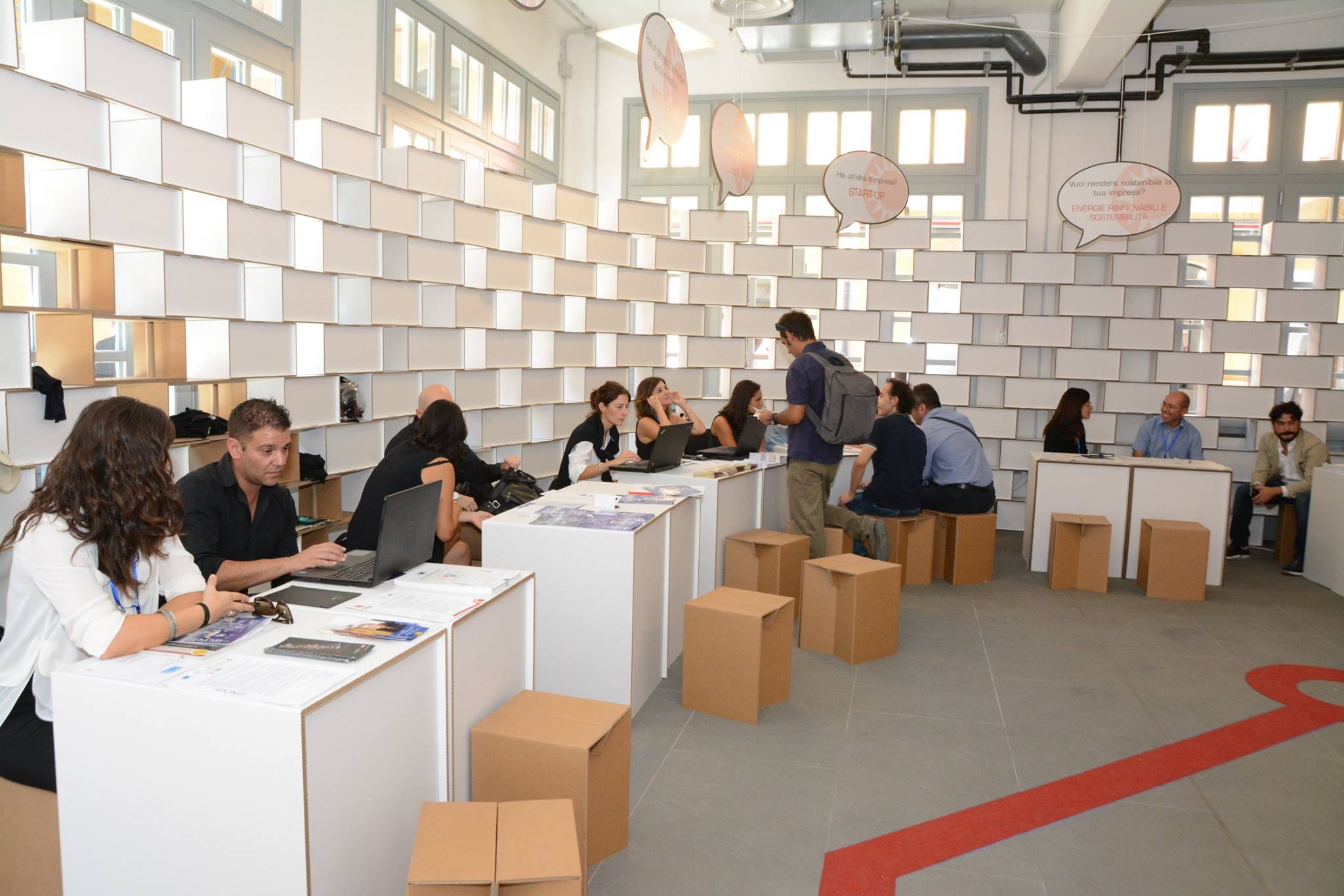 Pensare ad uno spazio che fosse sostenibile per arrivare ad un futuro consapevole dei cambiamenti in atto e di quanto sia importante fare ognuno la propria parte è stata una sfida. Si parlava di innovazione e gli attori in gioco nella manifestazione erano e sono ancora gli artefici di uno sviluppo sociale ed economico equo e giusto per tutti. Molte le università presenti e le amministrazioni locali che danno supportato i progetti per i vari settori. Abbiamo pensato perciò di dare forma ai volumi dando loro uno stile molto futurista ma mantenendo una indispensabile anima green. L’allestimento ecosostenibile copriva molte aree dello spazio a disposizione. Gli elementi più caratteristici sono state le pareti dei vari stand degli atenei della regione presenti che in alcuni casi fungevano da veri e propri sfondi in altri in semplici divisori dinnanzi alle quali sono state posizionate consolle o postazioni per l’incontro con i visitatori. In alcuni stand queste pareti curvavano nello spazio, distorcendosi in una volta di immaginifici pixel,  sullo sfondo del quale di componeva il logo aziendale. L’info point centrale in cui si accoglievano i visitatori all’entrata è stato realizzato con banconi consolle della serie Vago in cartone bianco e logo stampato della manifestazione. Le singole postazioni prevedevano un banco a forma di cubo realizzati su misura per l’occasione e degli sgabelli della serie SoiLo spazio dedicato ai convegni è stato arredato con poltrone della serie Golliaz con relativi tavoli, sgabelli Soi Plus e sedie pe il pubblico della linea Taviela