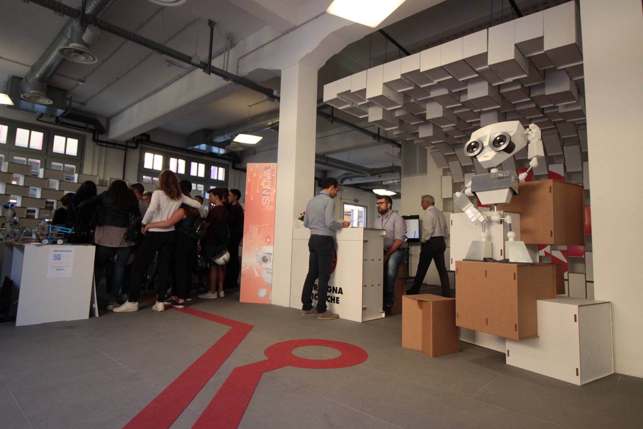 Per abbellire lo spazio sono stati infine realizzate strutture costituite da cubi incastrati e colorati, banner indicativi e cartonati del robottino mascotte della manifestazione.