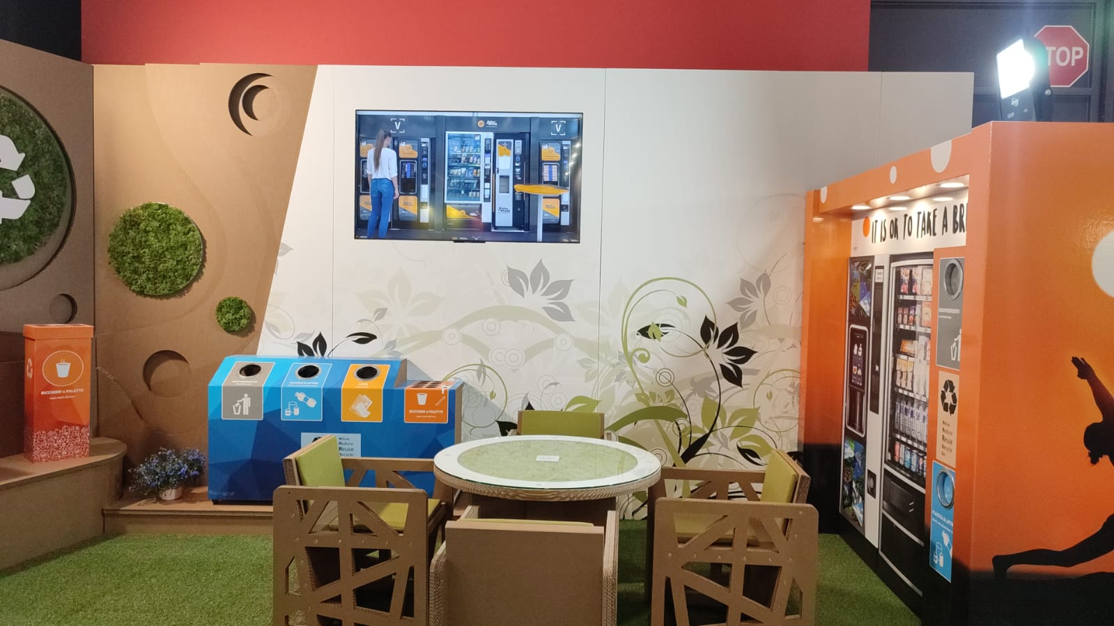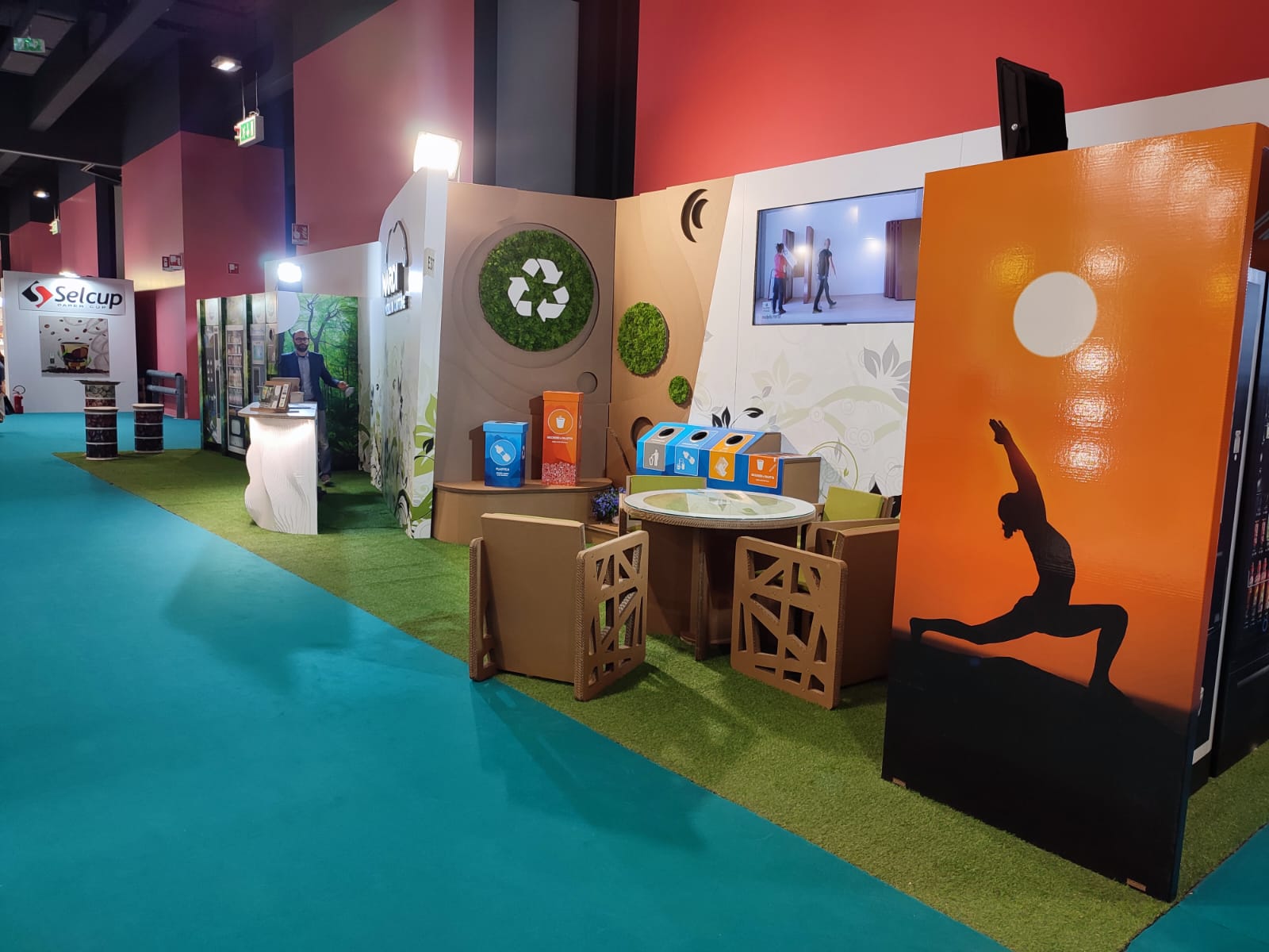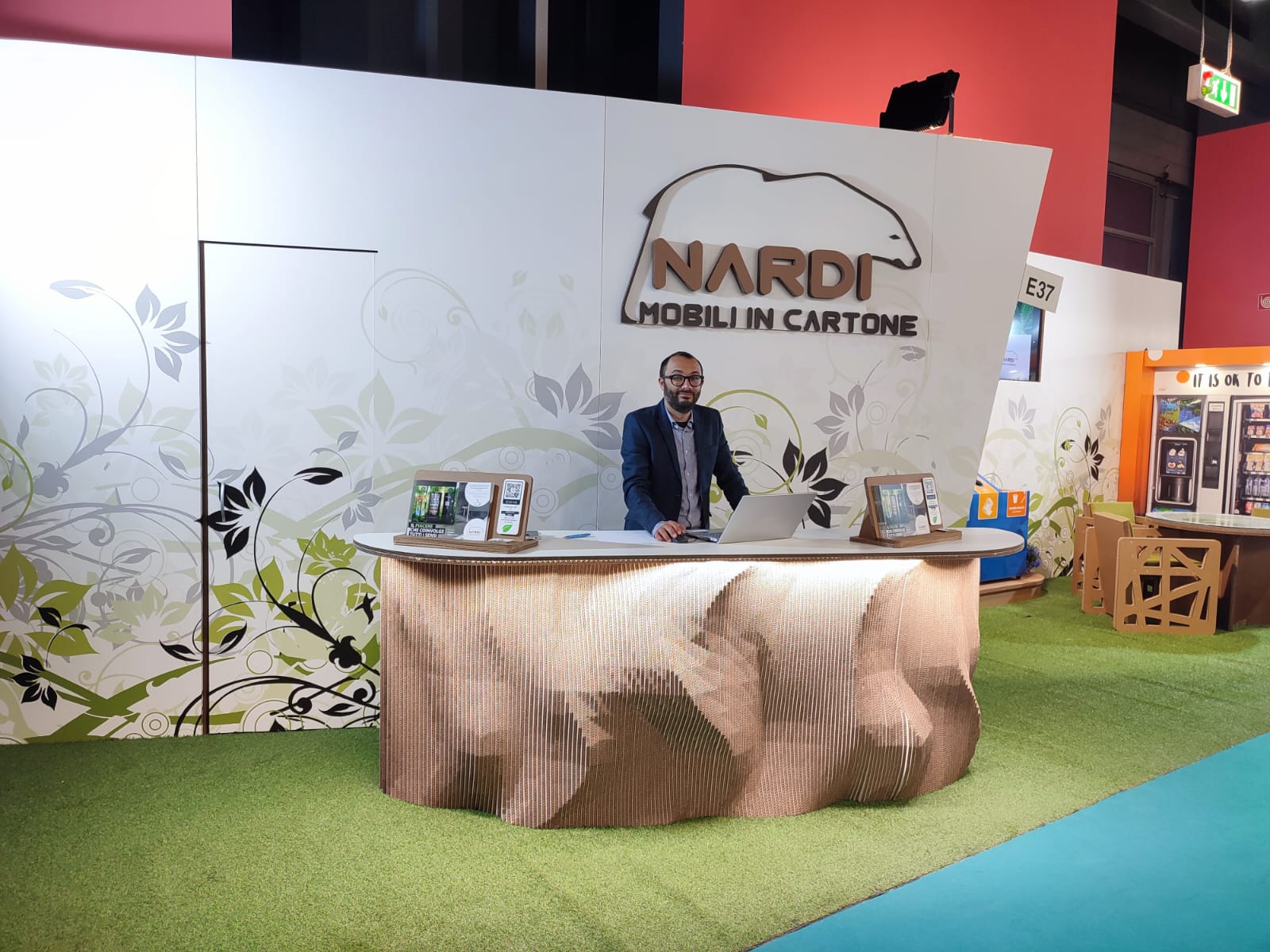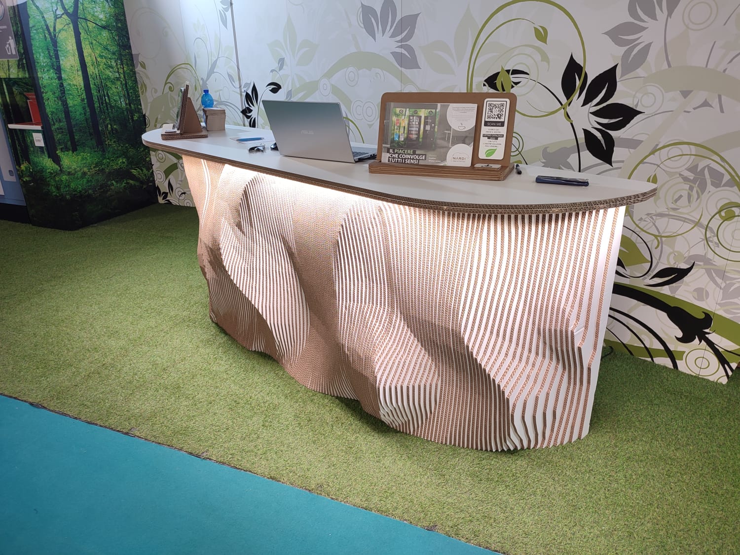 Per una volta abbiamo realizzato uno stand che rappresentasse noi stessi, dal design innovativo e capace di ospitare tutte le soluzioni sostenibili per questo settore che abbiamo ideato. L’area aperta è delimitata da una parete di fondo scenica in cartone dal taglio trasversale a creare un angolo separato dalla zona di accoglienza in cui approfondire la presentazione dei nostri prodotti. Arredi di design ecologici, strutture di rivestimento per i distributori automatici, moduli per la raccolta differenziata, non solo sono stati i prodotti che abbiamo presentato ma nello stesso tempo sono stati parte integrante del nostro allestimento. La parte più scenica è stata senza dubbio il grande bancone reception realizzato con pannelli dal tagliati ed assemblati in modo da dare un effetto 3D.