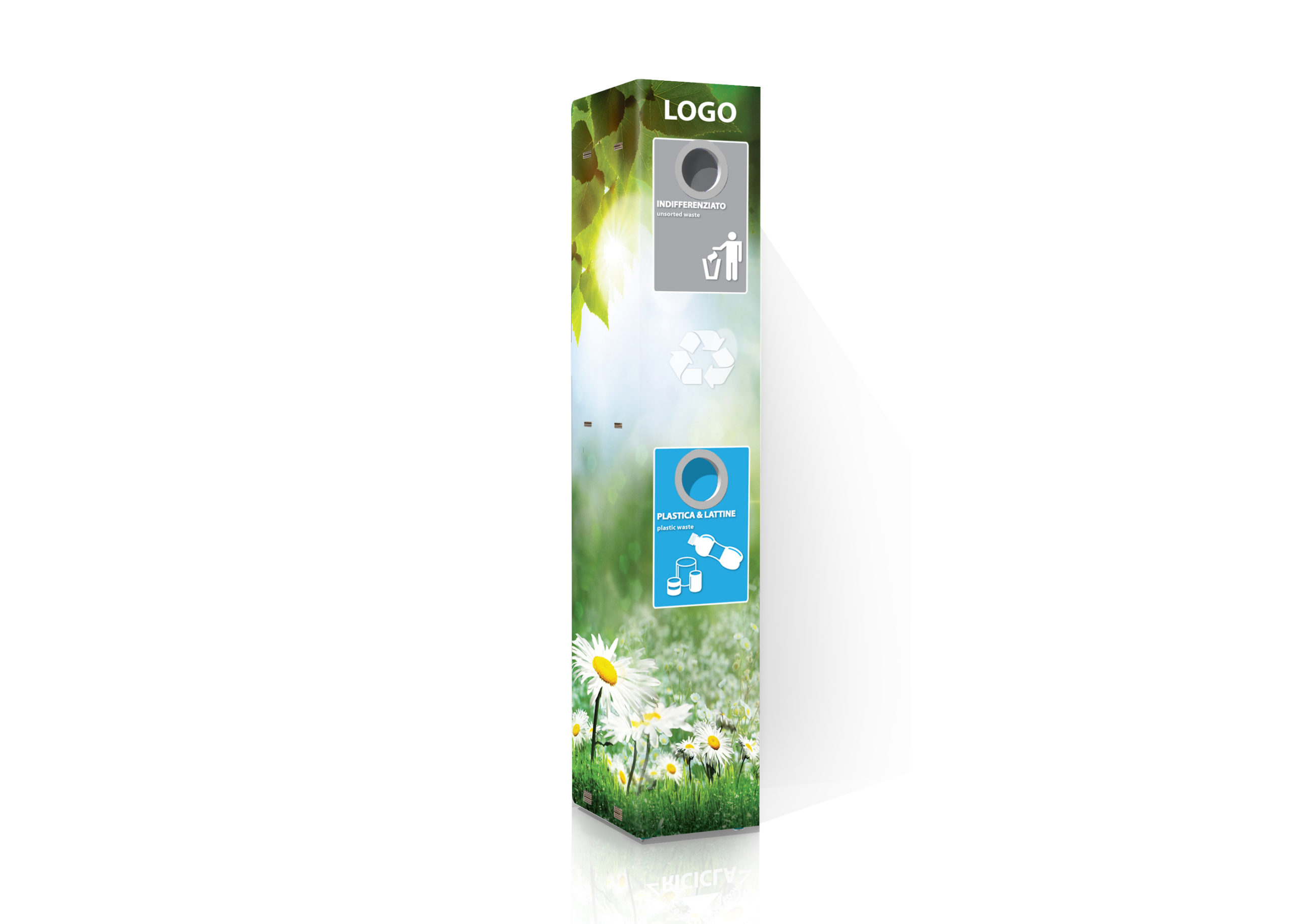 Il differenziatore a colonna verticale a due vani è realizzato in cartone plastificato, garantendo resistenza e durabilità. È personalizzabile con grafiche e colori aziendali, ideale per integrarsi esteticamente negli ambienti. Dotato di ruote, offre facilità di spostamento e posizionamento. Questo design non solo ottimizza lo spazio e facilita l’organizzazione, ma anche promuove pratiche sostenibili grazie al materiale ecologico utilizzato. Il differenziatore è dotato di 2 cassetti estraibili per lo smistamento. Questo cestino per la raccolta differenziata a colonna, viene integrato nei rivestimenti per distributori automatici modelli Payer, Velan e Profa
