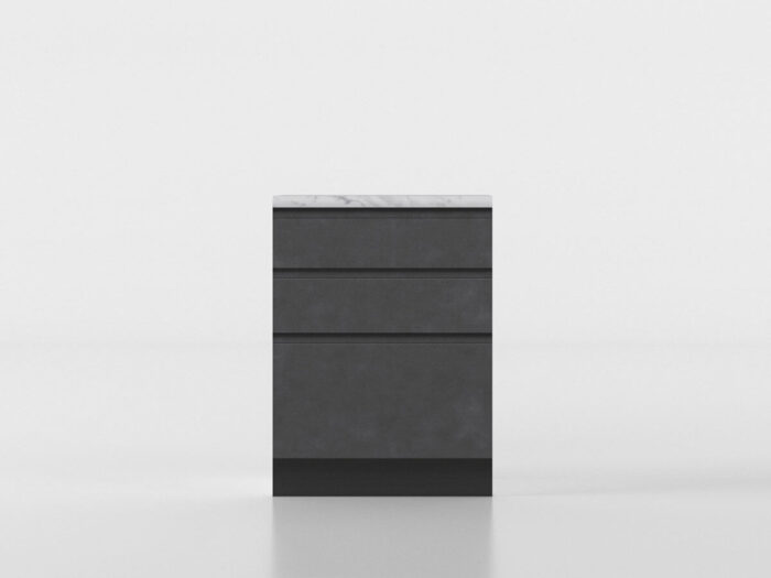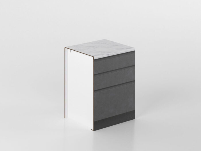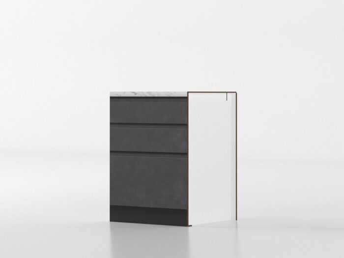 La base cassetti da 60 cm della cucina Cassandra è realizzata in cartone resistente da 7 mm, progettata per offrire praticità e stile in allestimenti temporanei di home staging. Il fronte antracite, stampato con precisione, conferisce un design moderno e sofisticato, mentre il top in effetto marmo aggiunge un tocco di eleganza e lusso. I cassetti, anch’essi stampati, riproducono fedelmente i dettagli di una cucina tradizionale, garantendo un impatto visivo realistico e curato. Grazie alla sua struttura modulare, la base può essere facilmente integrata in diverse composizioni, adattandosi a spazi di ogni dimensione. Questa soluzione innovativa è perfetta per chi desidera creare ambienti funzionali e attraenti con un basso impatto ambientale, grazie all’uso di materiali ecologici. La base cassetti Cassandra unisce estetica, sostenibilità e versatilità, rendendola ideale per chi cerca una soluzione rapida e decorativa per allestimenti temporanei.