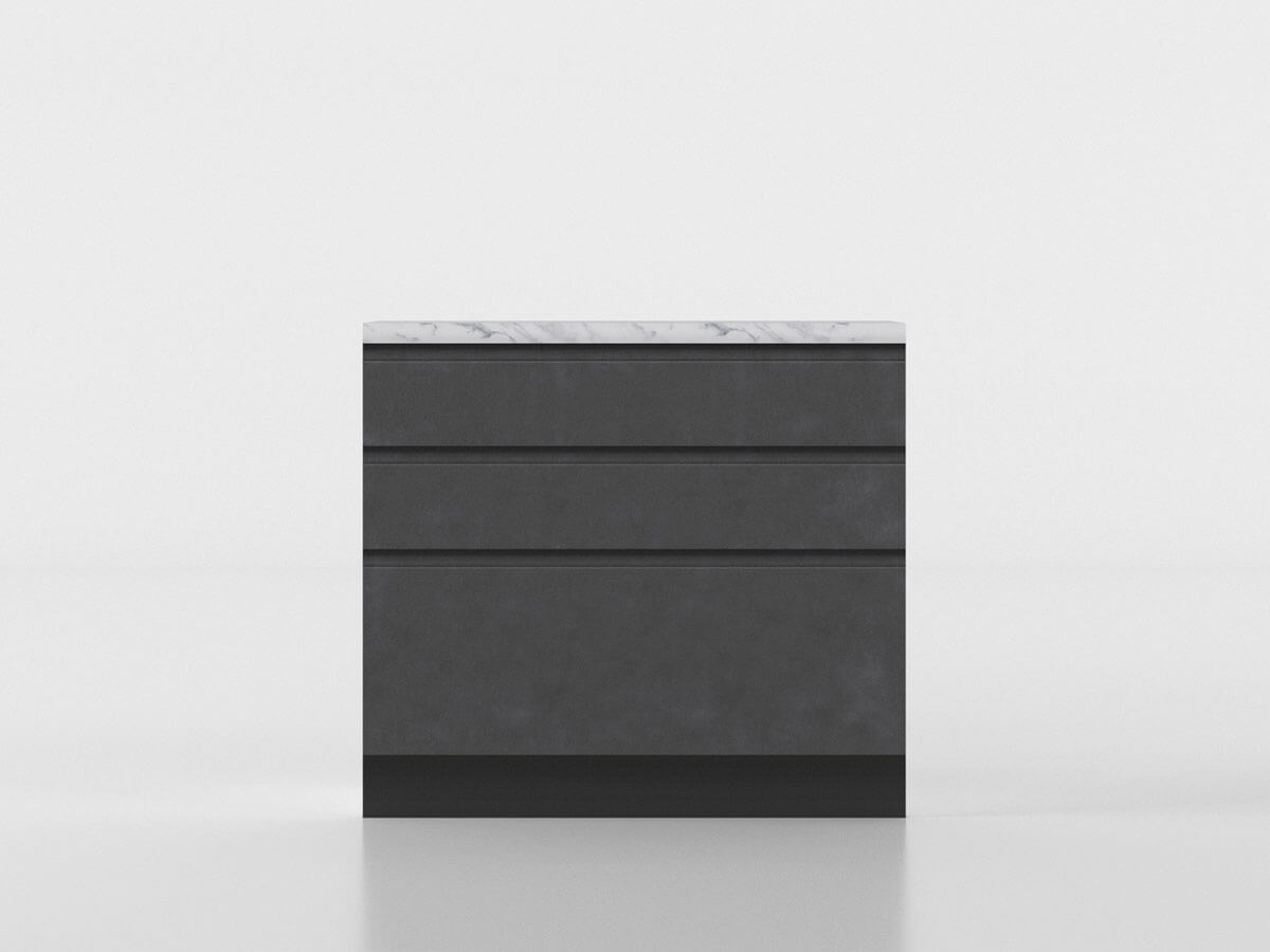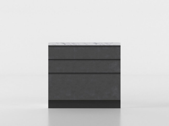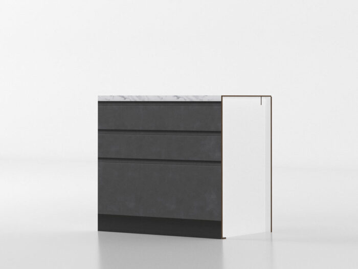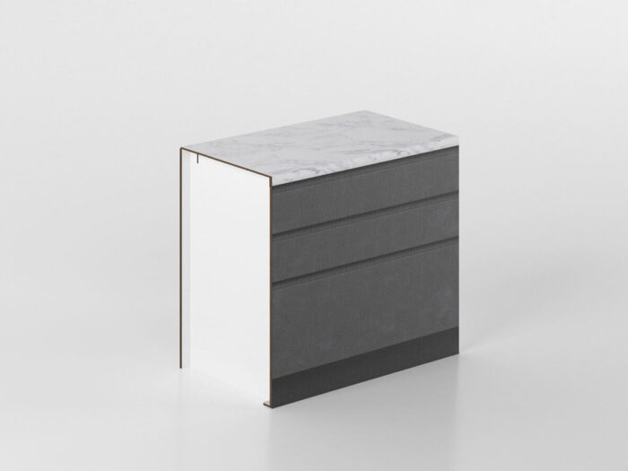 La base cassetti da 90 cm della cucina in cartone Cassandra fa parte della nuova linea di cucine progettate per home staging, pensata per combinare praticità, estetica e sostenibilità. Realizzata in cartone ecologico da 7 mm, è una soluzione leggera e robusta, ideale per allestimenti temporanei. La stampa sul fronte antracite riproduce i cassetti di una cucina moderna, mentre il top in effetto marmo aggiunge un tocco di lusso e raffinatezza.