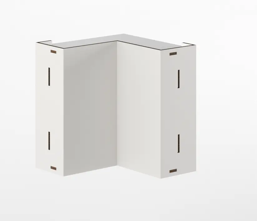 Il pensile base angolare da 60 cm della cucina stampata Clarea è il modulo ideale per creare allestimenti dimostrativi funzionali e d’impatto. Realizzato in cartone leggero e resistente, è pensato per diventare il punto di snodo tra i pensili della stessa linea, rendendo possibile la creazione di angoli ben strutturati. Grazie al sistema ad incastro con moduli reggi pensili, l’installazione risulta semplice, veloce e senza attrezzi. La finitura grigia stampata dona un effetto realistico, sobrio e versatile, perfetto per integrarsi sia in ambienti moderni che classici. Questo modulo base angolare è stato progettato per home staging, esposizioni e fiere, dove l’impatto visivo e la facilità di montaggio sono fondamentali. La cucina Clarea, grazie a questo pensile angolare, si adatta a ogni spazio con eleganza e praticità, offrendo una soluzione sostenibile e scenografica per arredamenti temporanei di grande effetto.