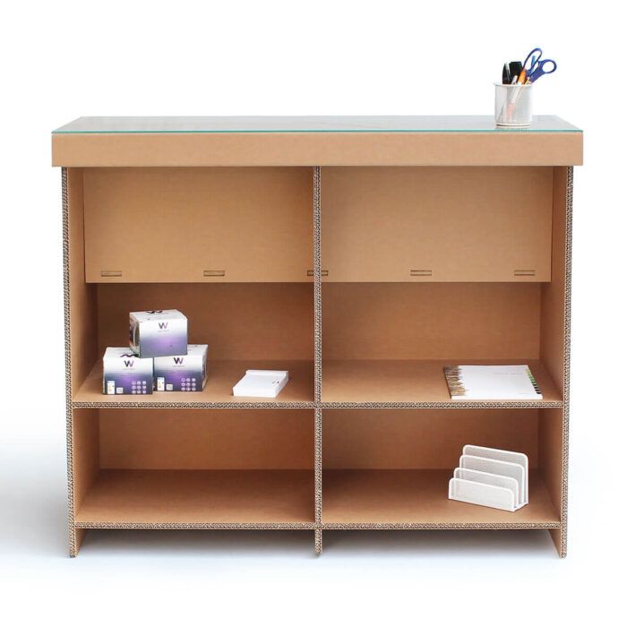 Il desk espositivo Vago E120 è una soluzione versatile e apprezzata per le sue due funzioni principali: accettazione ed esposizione. La parte anteriore di questo desk è caratterizzata da una superficie bassa di cartone liscio che può essere personalizzata con grafiche a piacimento, offrendo un’opportunità di branding unica. All’interno del desk, quattro spaziosi vani forniscono una zona ideale per riporre materiali e oggetti personali, garantendo un ambiente organizzato e professionale. Nella parte superiore frontale invece è stato ricavato un vano espositore capiente.