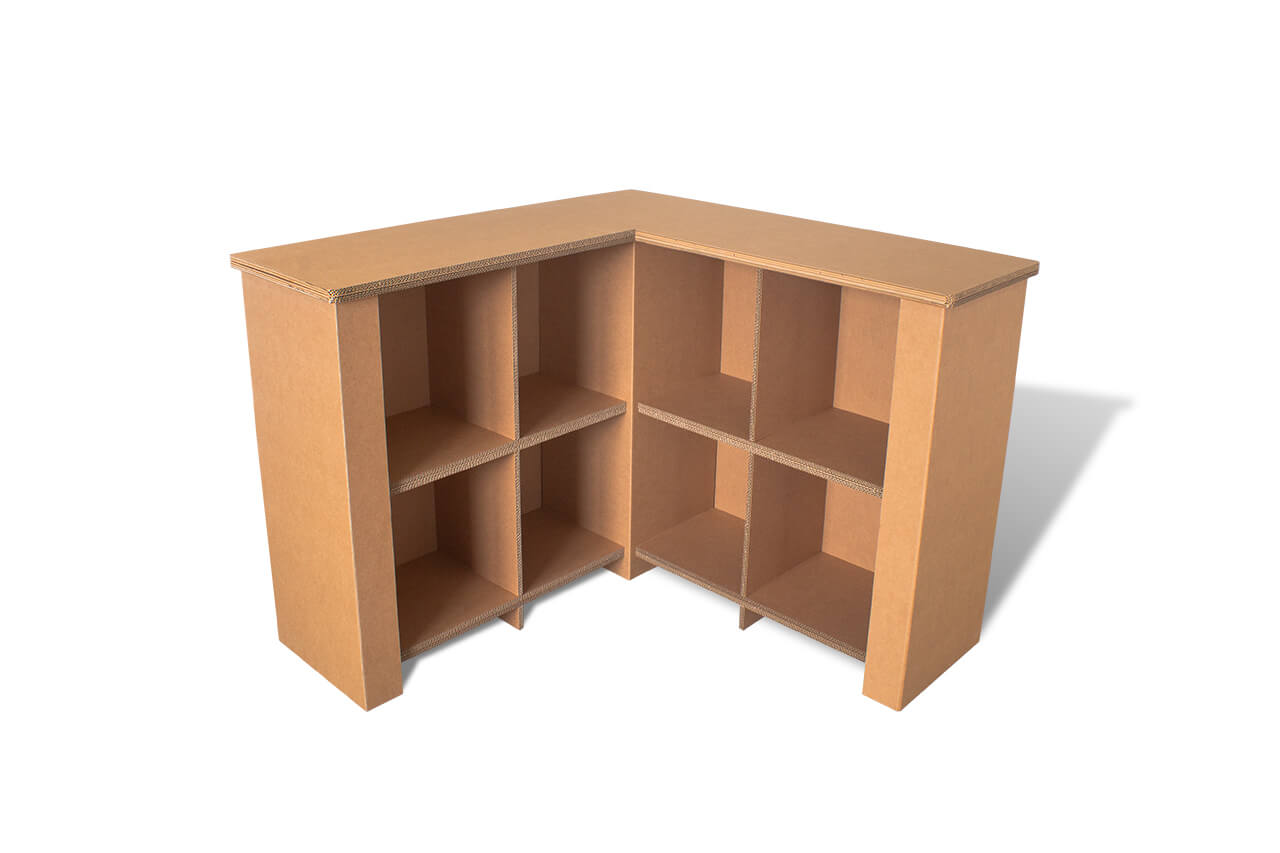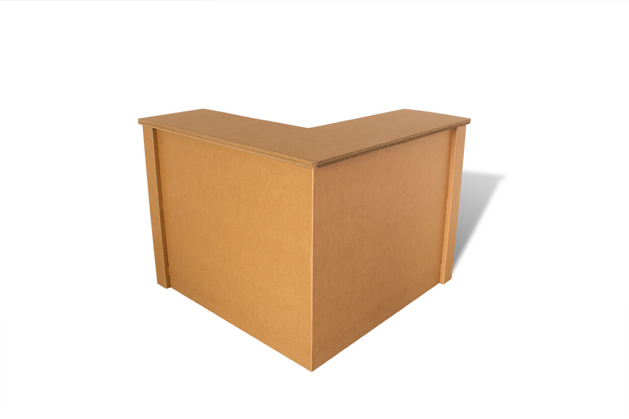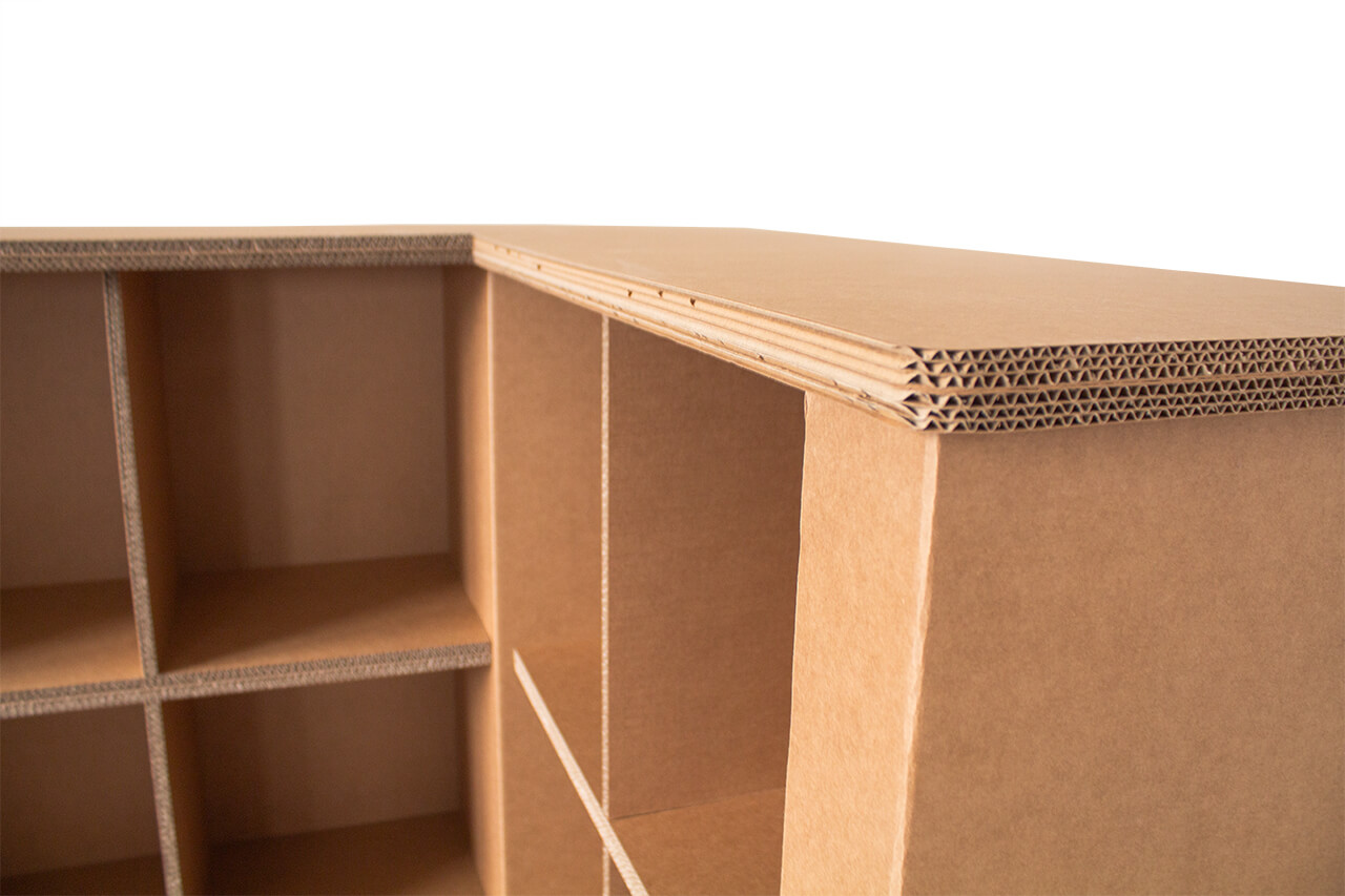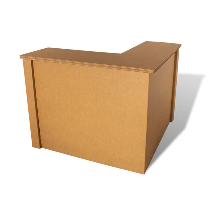 Il banco reception ecologico in cartone angolare grande Verra E è una nuova aggiunta alla gamma Verra, rinomata per la sua funzionalità e design sostenibile. Questo modello, con dimensioni di 128x128x98 cm, è il più grande della linea e la sua forma angolare lo rende perfetto per essere posizionato negli angoli, ideale per chi dispone di spazi limitati. Il retro del banco è dotato di pratici ripiani che permettono di organizzare efficacemente il materiale necessario per le operazioni di cassa, ottimizzando lo spazio di lavoro.