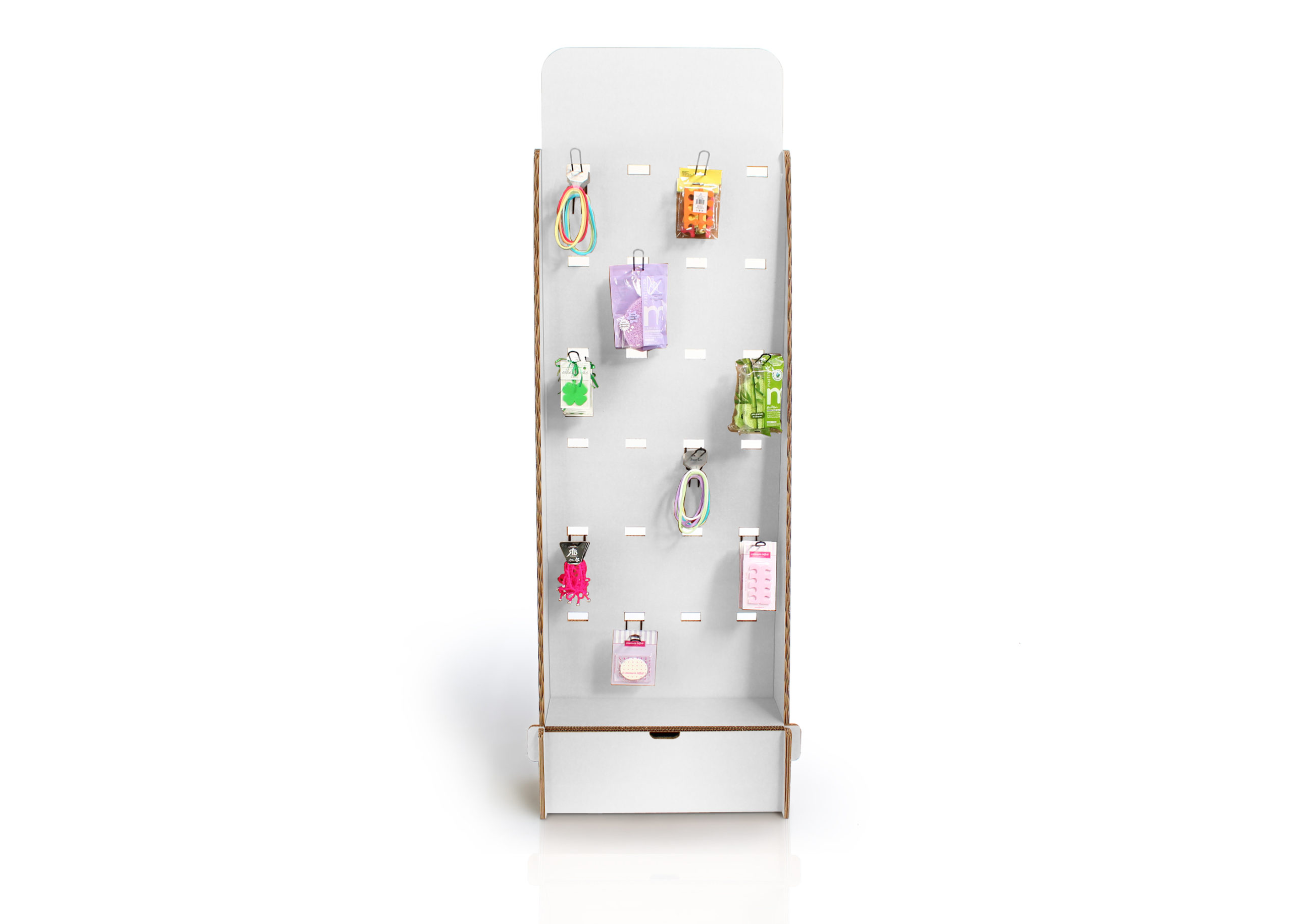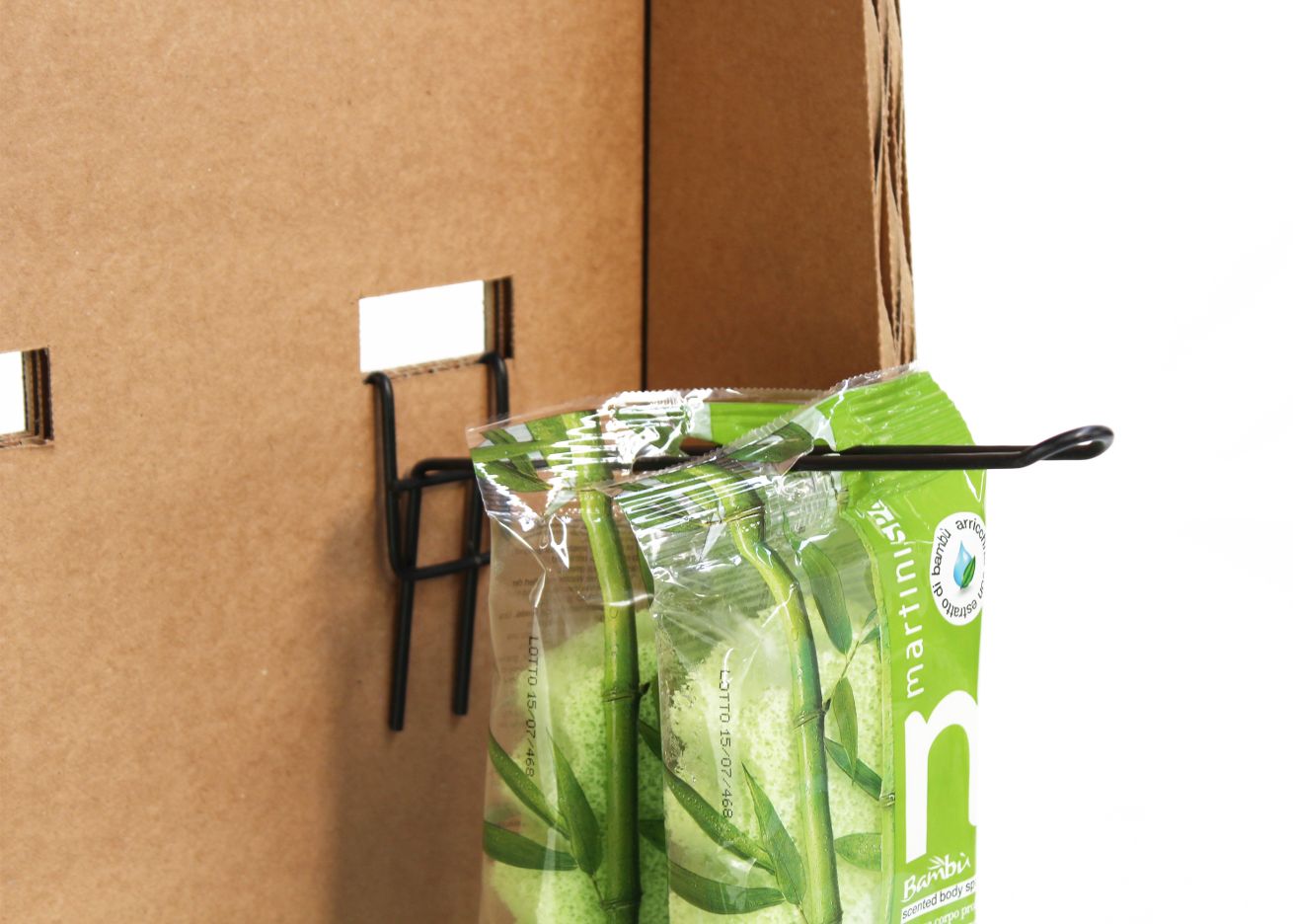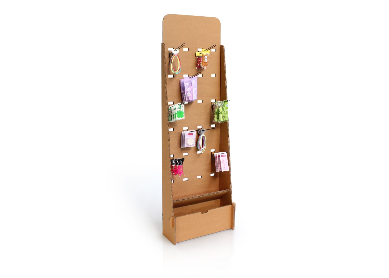 Plem è un espositore portablister  in cartone ecologico autoportante progettato e realizzato per l’esposizione di prodotti con sistema blister. La struttura solida e lineare permette una mostra chiara ed ordinata della merce in verticale. Plem è realizzato interamente in cartone riciclabile, prevede una cassetto chiuso in cui riporre la merce ed è personalizzabile con stampe digitali ad alta definizione sia sul fronte che sul retro. I ganci sono previsti di lunghezza variabile a seconda delle esigenze del cliente. Ogni elemento comprende  un numero pari a 8 portablister.