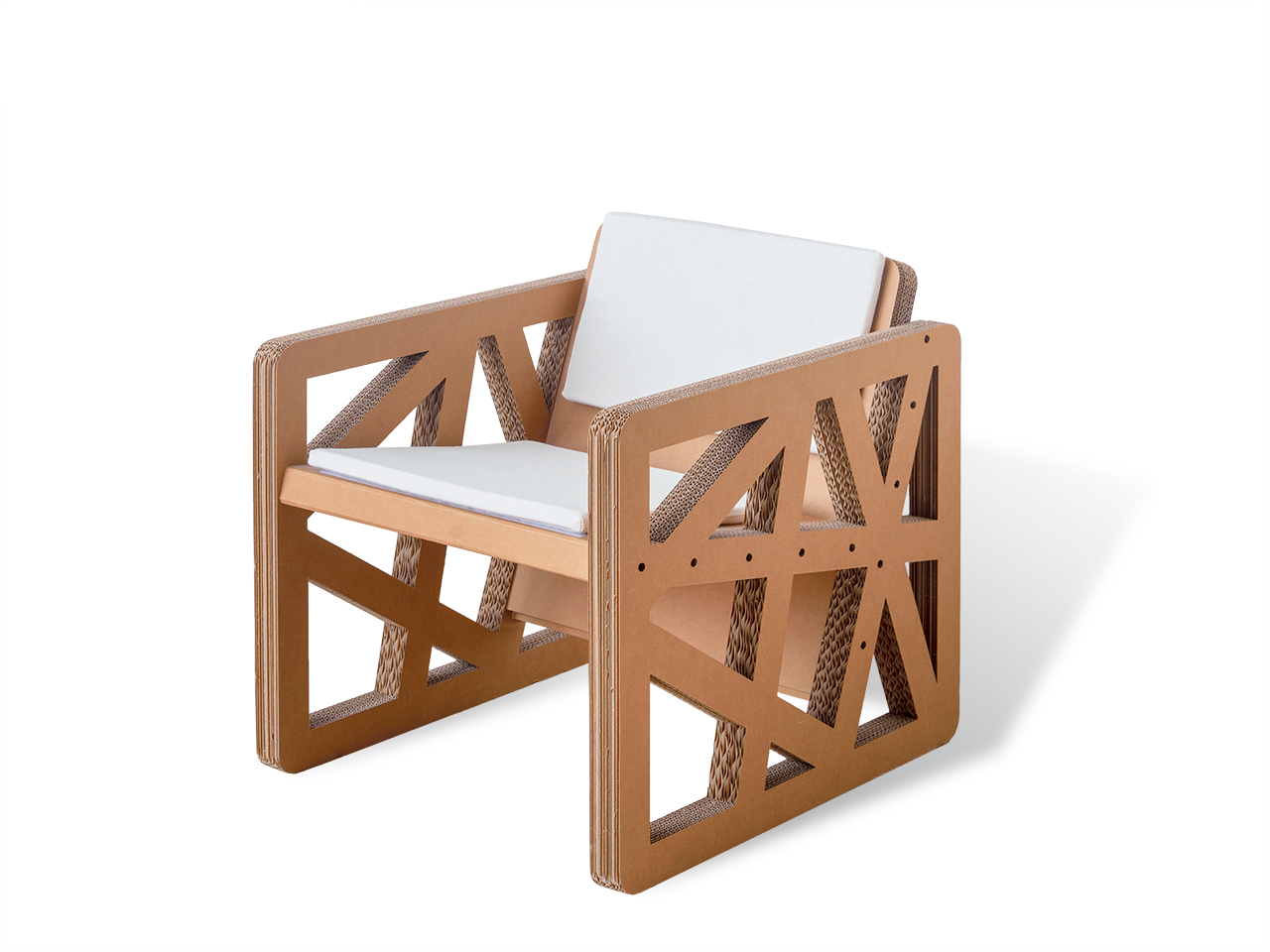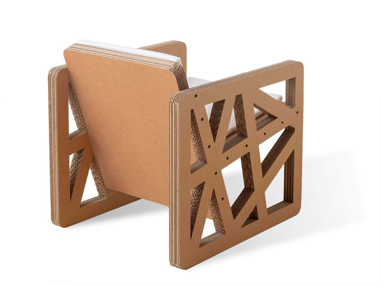 Il punto forte è lo schienale inclinato così come il pianale favorendo così una posizione rilassata durante l’uso. Il comfort è ulteriormente migliorato dal cuscino in cotone, che aggiunge morbidezza alla seduta. Non solo esteticamente accattivante, ma anche pratica: la leggerezza e la facilità di spostamento permettono una versatilità notevole, consentendo di riorganizzare facilmente gli spazi secondo le esigenze. La combinazione di materiali innovativi come il cartone e il tessuto naturale come il cotone la rende un esempio di design ecologico.