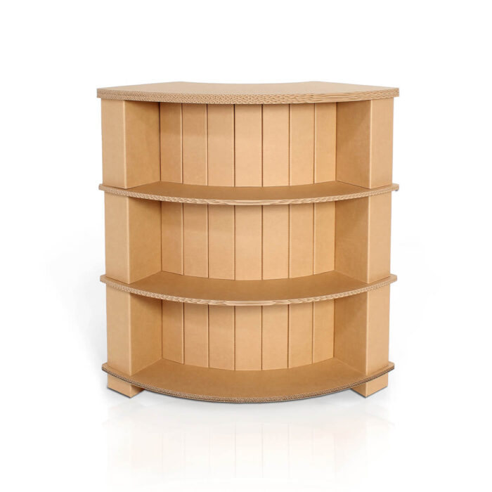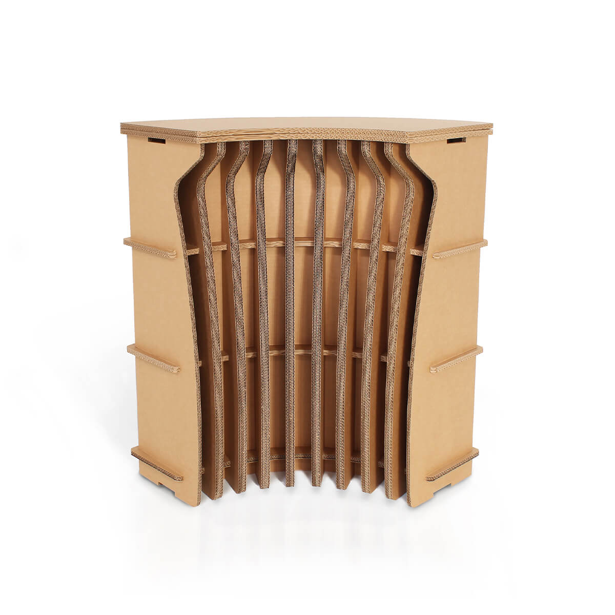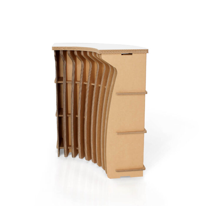 Il banco reception in cartone della serie Galabra DI 90 con curva interna del piano è l’elemento modulare perfetto per completare un allestimento di banco reception più ampio, che può includere sia parti circolari che lineari. La sua caratteristica principale è la curvatura interna del piano, che segue un design elegante e funzionale. Le doghe verticali sono disposte in perfetta armonia con questa curvatura, creando un aspetto coerente e sofisticato.
