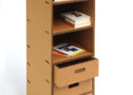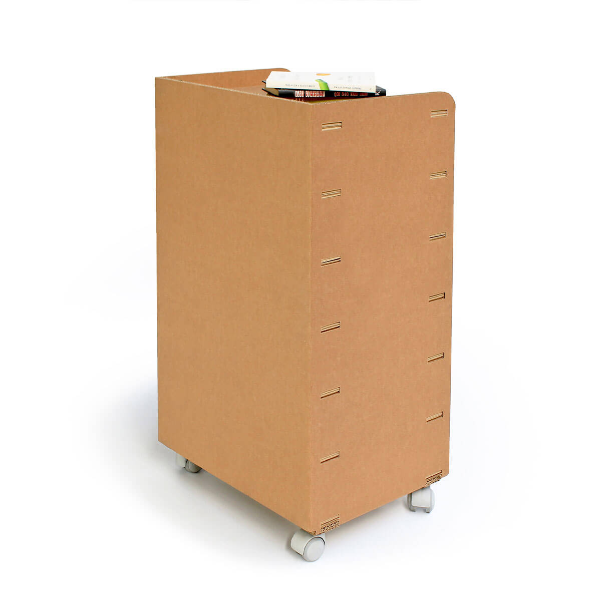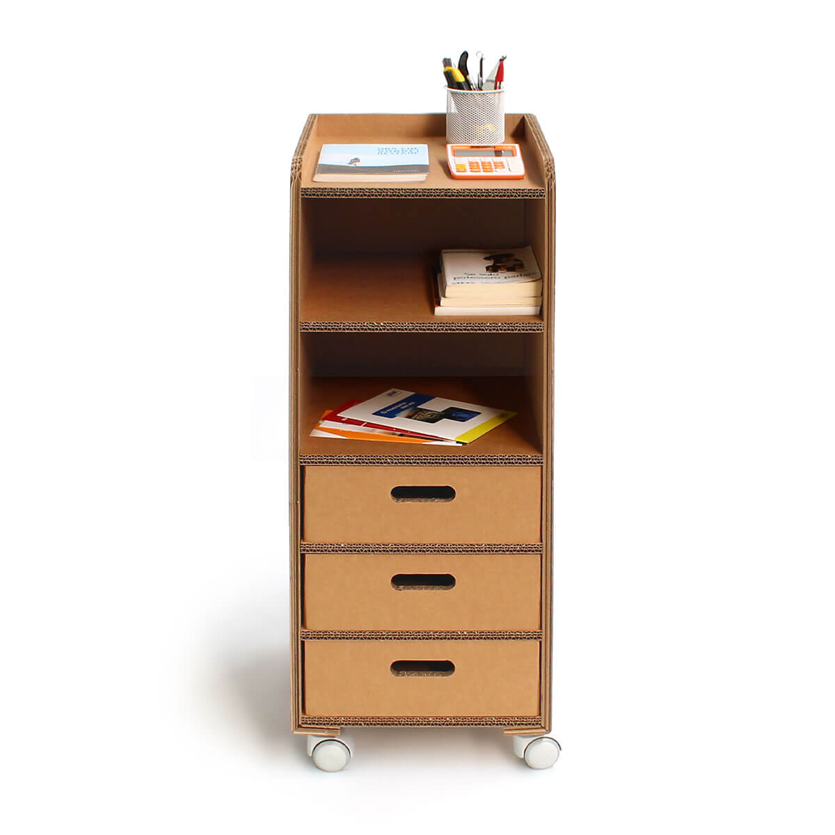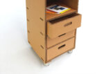 Nella parte soprastante è stato creato un piano con sponde, utile per collocare oggetti a portata di mano. La cassettiera risulta essere leggera ma nello stesso tempo solida e, grazie alle ruote piroettanti, può essere spostata facilmente. La cassettiera può essere acquistata con un numero vario di cassetti e con vani a giorno di diverse dimensioni.